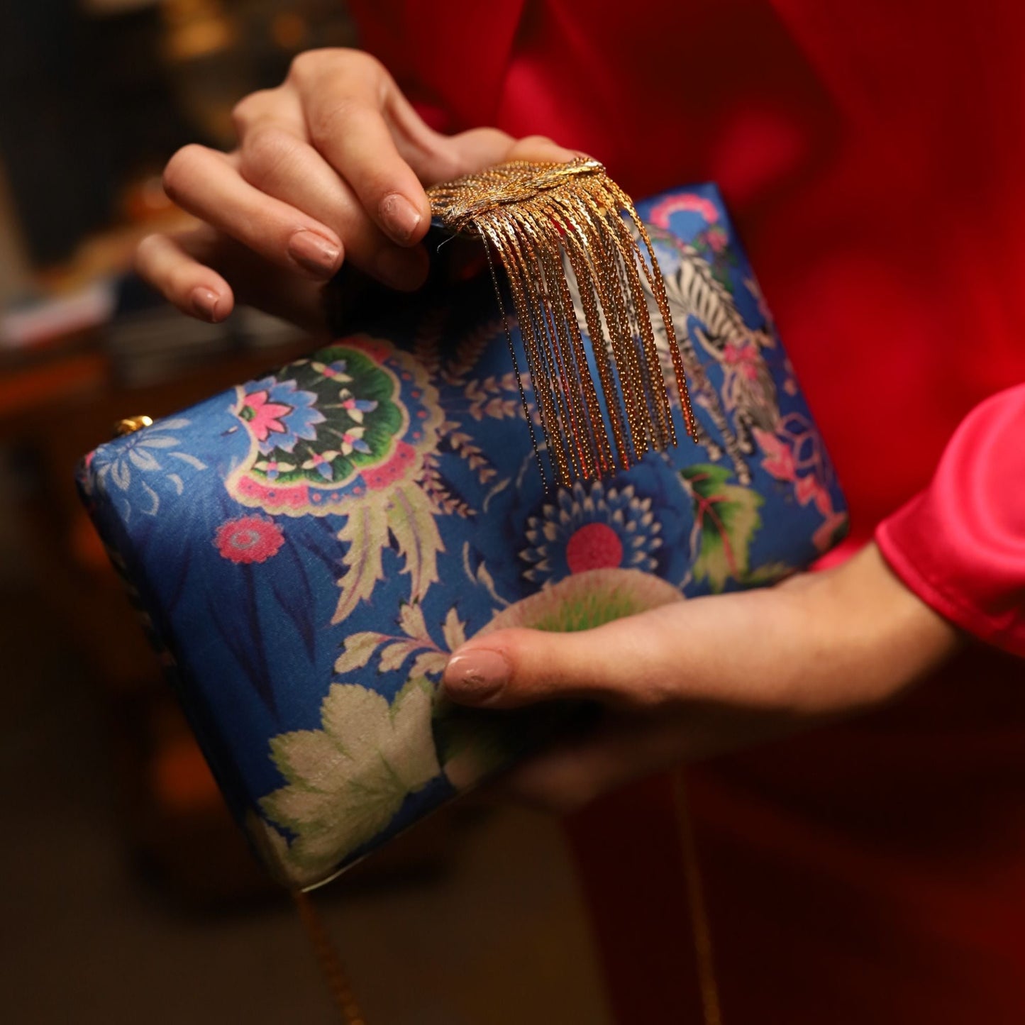 Your portal to a whimsical safari where reality blends seamlessly with imagination. Fuschia fields alongside the graceful dance of zebras and the vibrant plumage of long-tailed parrots, this clutch is your own natural sanctuary. The mixed metallic fringe strap, like a magical thread, ties together this mesmerizing escape.