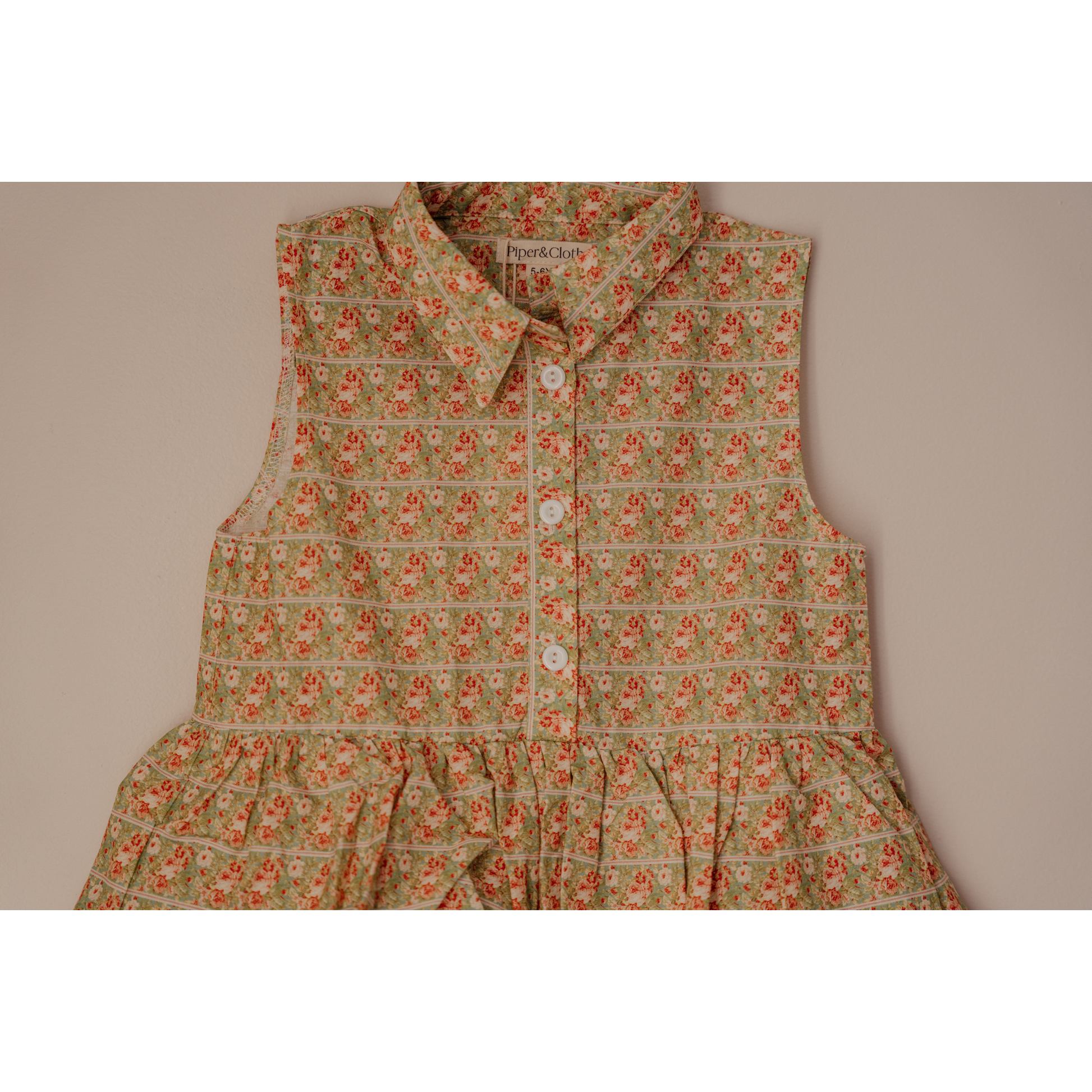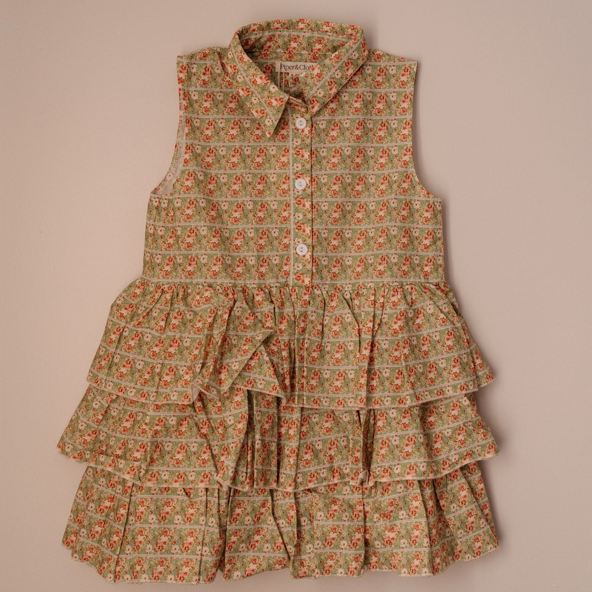 This sleeveless dress features a button-down front and a neatly tailored collar for a refined touch. The multi-tiered ruffle skirt adds a playful flair, while the intricate floral print brings a vintage-inspired charm.