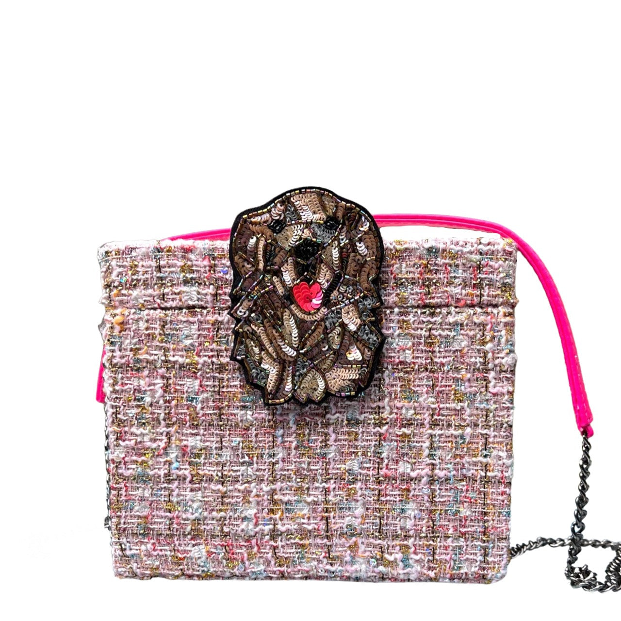 - Tweed fabric briefcase bag with a hand embroidered golden retriever flap closure
