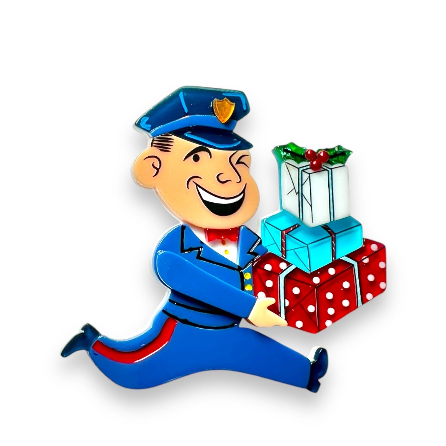 Welcome the holiday season with the Christmas Happy Mail Earrings by 50's Vintage Dame x Lipstick & Chrome! These earrings were illustrated by 50s Vintage Dame and depict a festive delivery man bringing you some extra holiday cheer. Made of durable acrylic material, this brooch is the perfect accessory to add some Christmas spirit to any outfit. Don't miss the matching brooch!