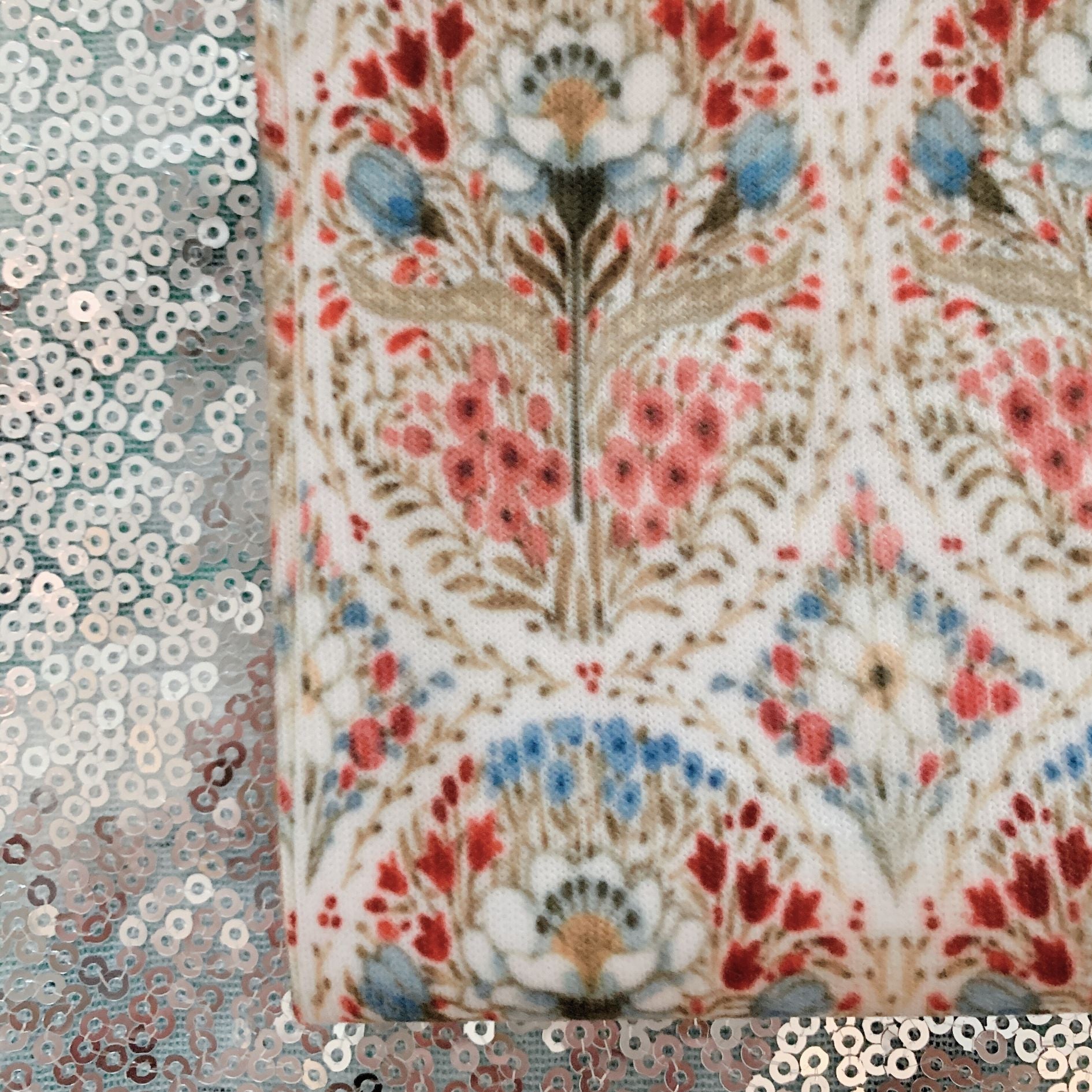 A pair of colorful socks displaying a rustic style floral pattern replicated from original hand painted art.