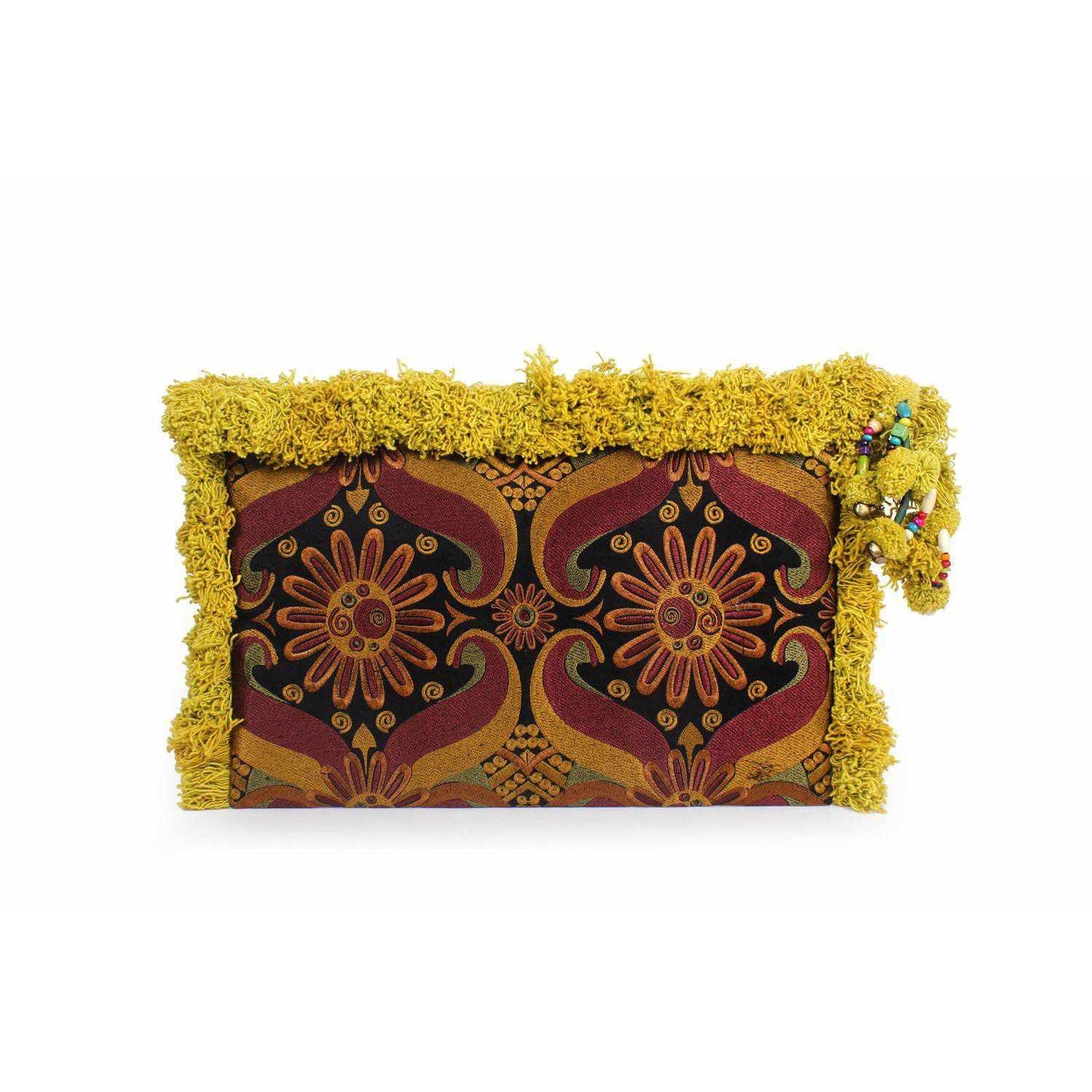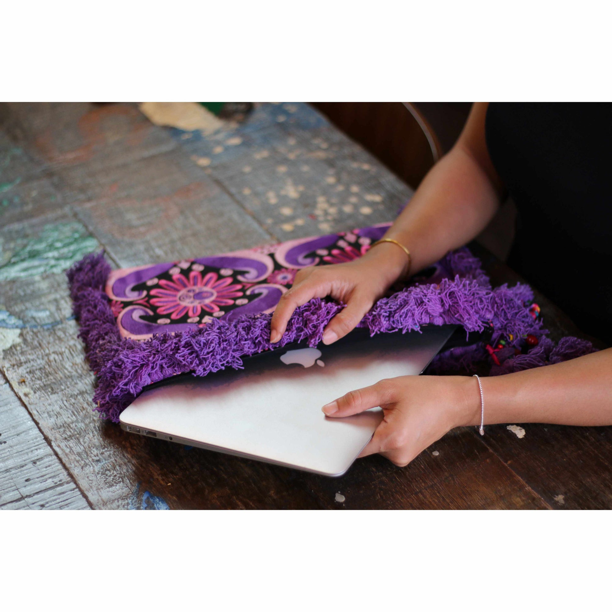 Carry your laptop in style with our gorgeous, limited edition carrying cases. Exquisite embroidery is finished with colorful tassels and a fun zipper pull. Finished with a carrying band on the back of the bag, perfect for slipping on your wrist! Lined with colorful lining and a zipper pocket inside for your chords.