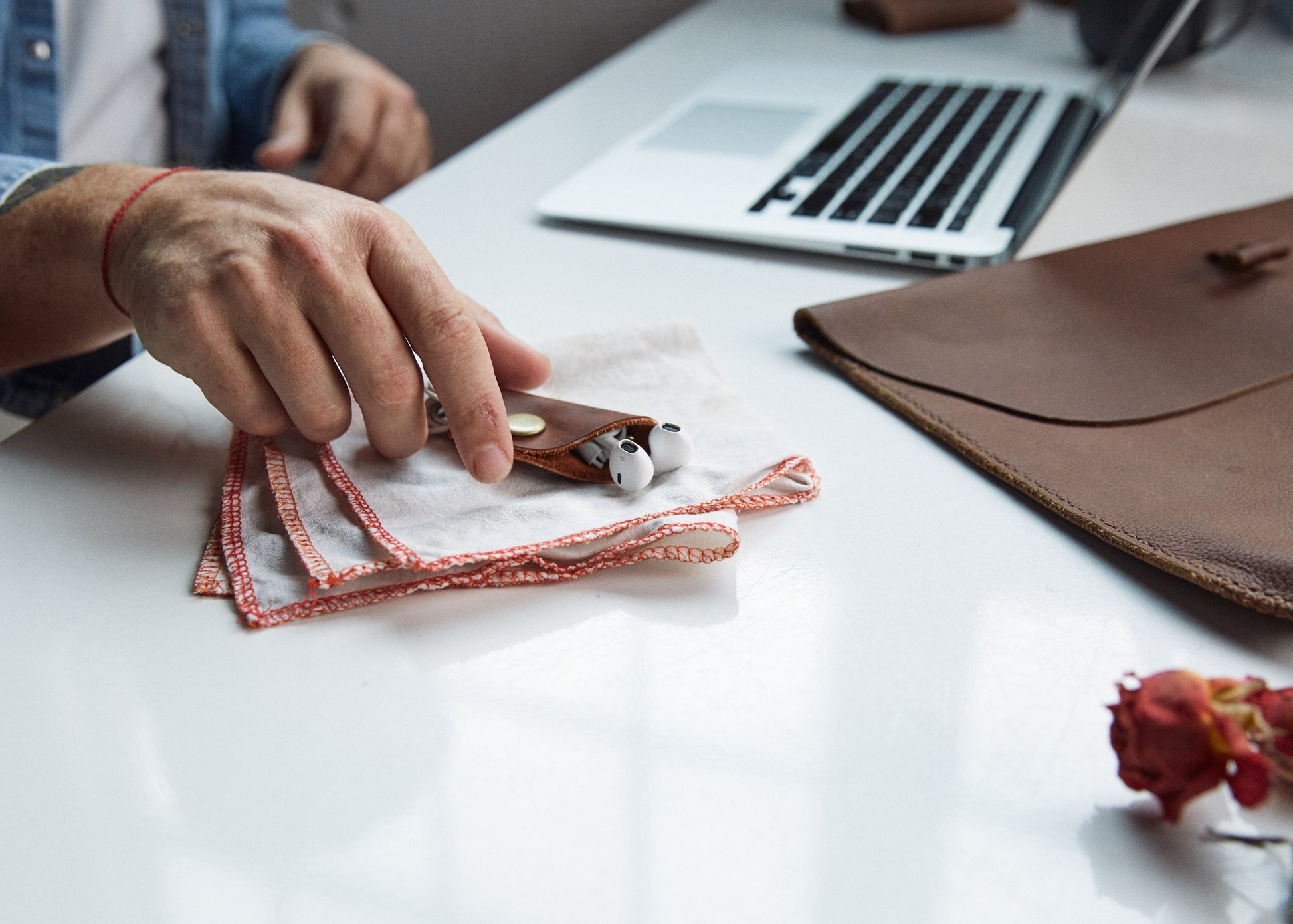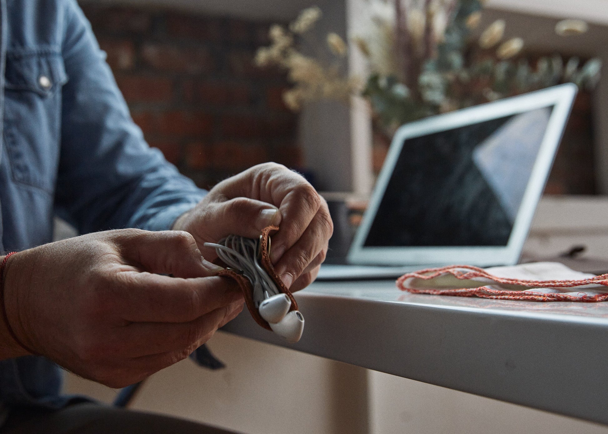 It’s Tuesday morning and your creative juices are flowing. You sit down at your desk to get started on a project and reach into your bag for your headphones only to pull out a tangled mess of cords! Sound familiar? The Cord Taco is the perfect solution for you. Wrap up your cords in the cord taco for easy, tangle free carrying. Made from leather scraps, it’s a socially responsible way to keep your life in order.