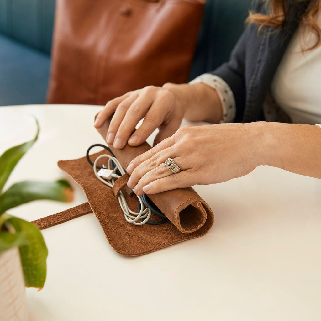 It’s Tuesday morning and your creative juices are flowing. You sit down at your desk to get started on a project and reach into your bag for your headphones only to pull out a tangled mess of cords and pens! Sound familiar? The Cord Traveler is the perfect solution for you. Our cord travelers have multiple leather loops for storing your cords, pens, and other small gadgets in a tidy way.