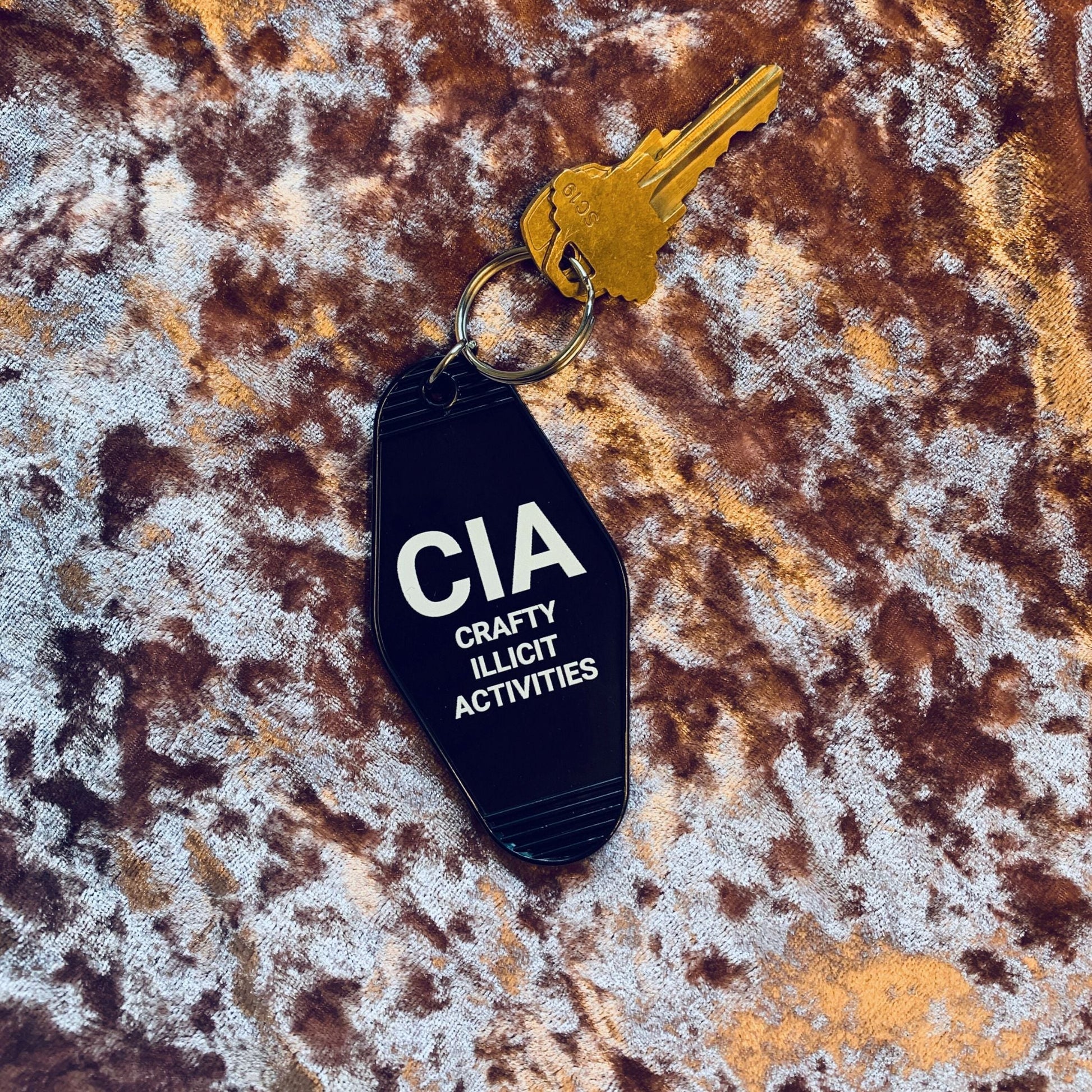 Elevate your keychain game with the Crafty Illicit Activities Motel Style Keychain in Black, a unique adaptation of classic hotel key tags. Made from durable plastic and metal, this keychain measures approximately 3.75" x 1.75" and features the phrase "GET BULLISH" on the back. A must-have accessory for anyone with a knack for crafty illicit activities, this exclusive Get Bullish keychain makes a thoughtful gift for the rebel in your life.