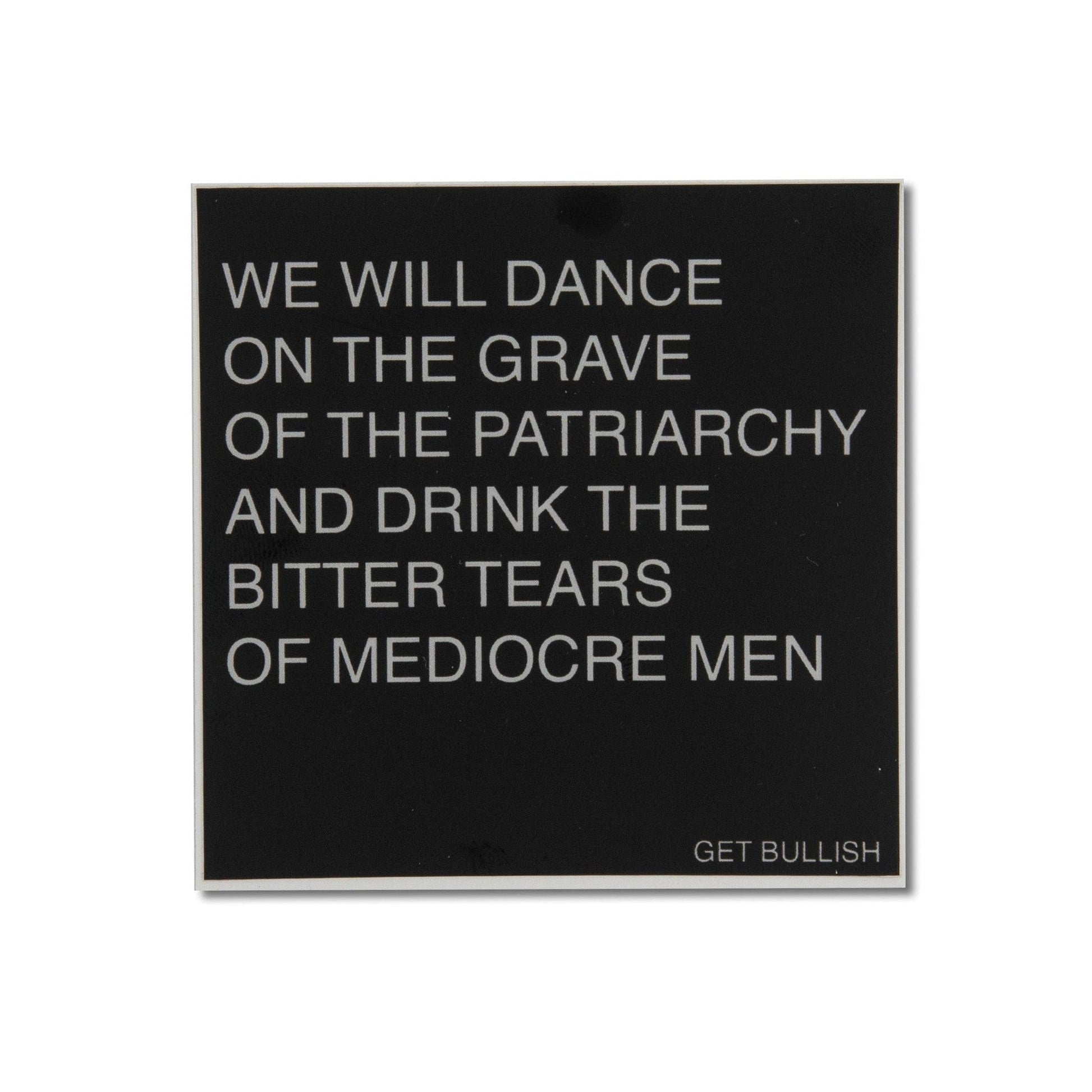 This sticker reads: DANCE ON THE GRAVE OF THE PATRIARCHY AND DRINK THE BITTER TEARS OF MEDIOCRE MEN