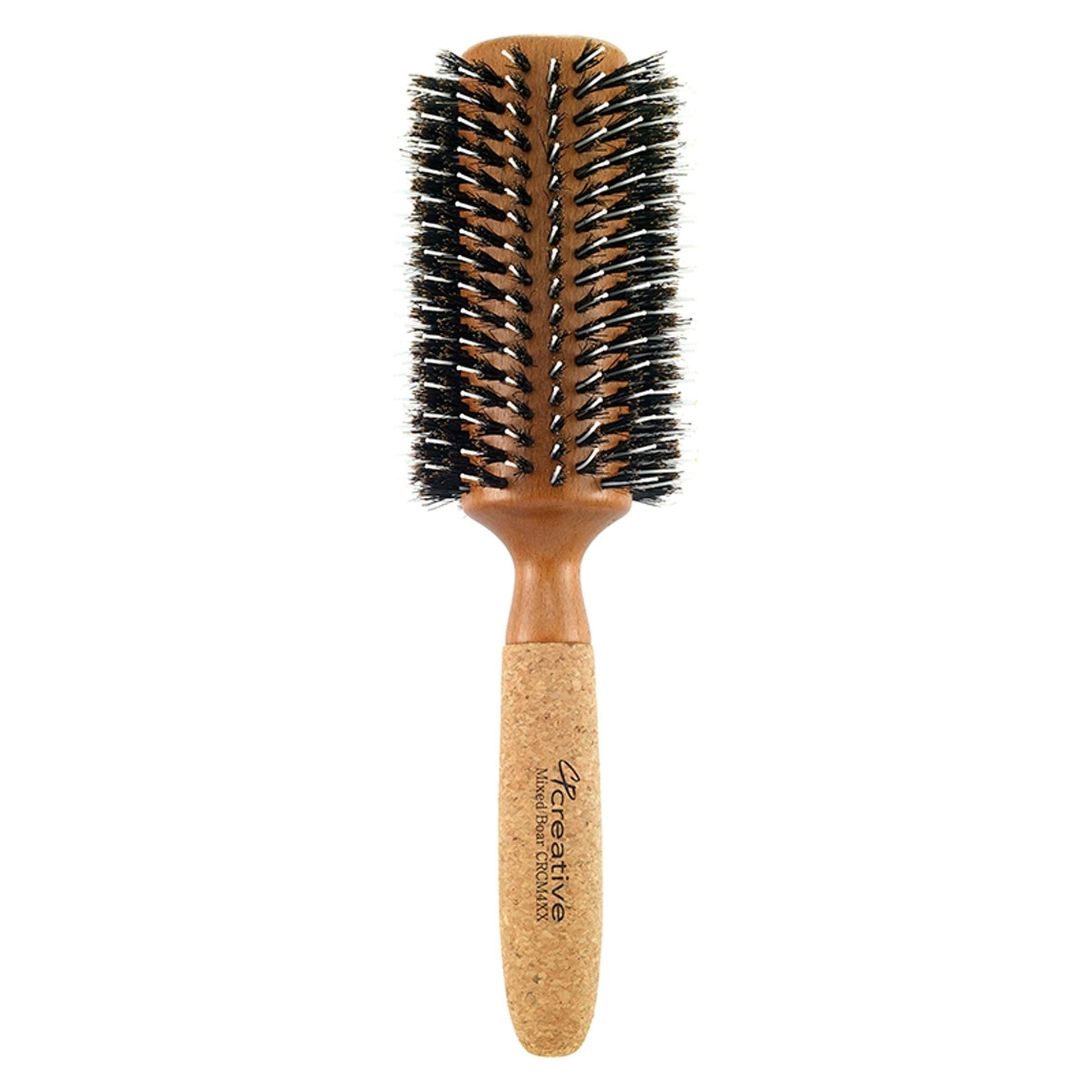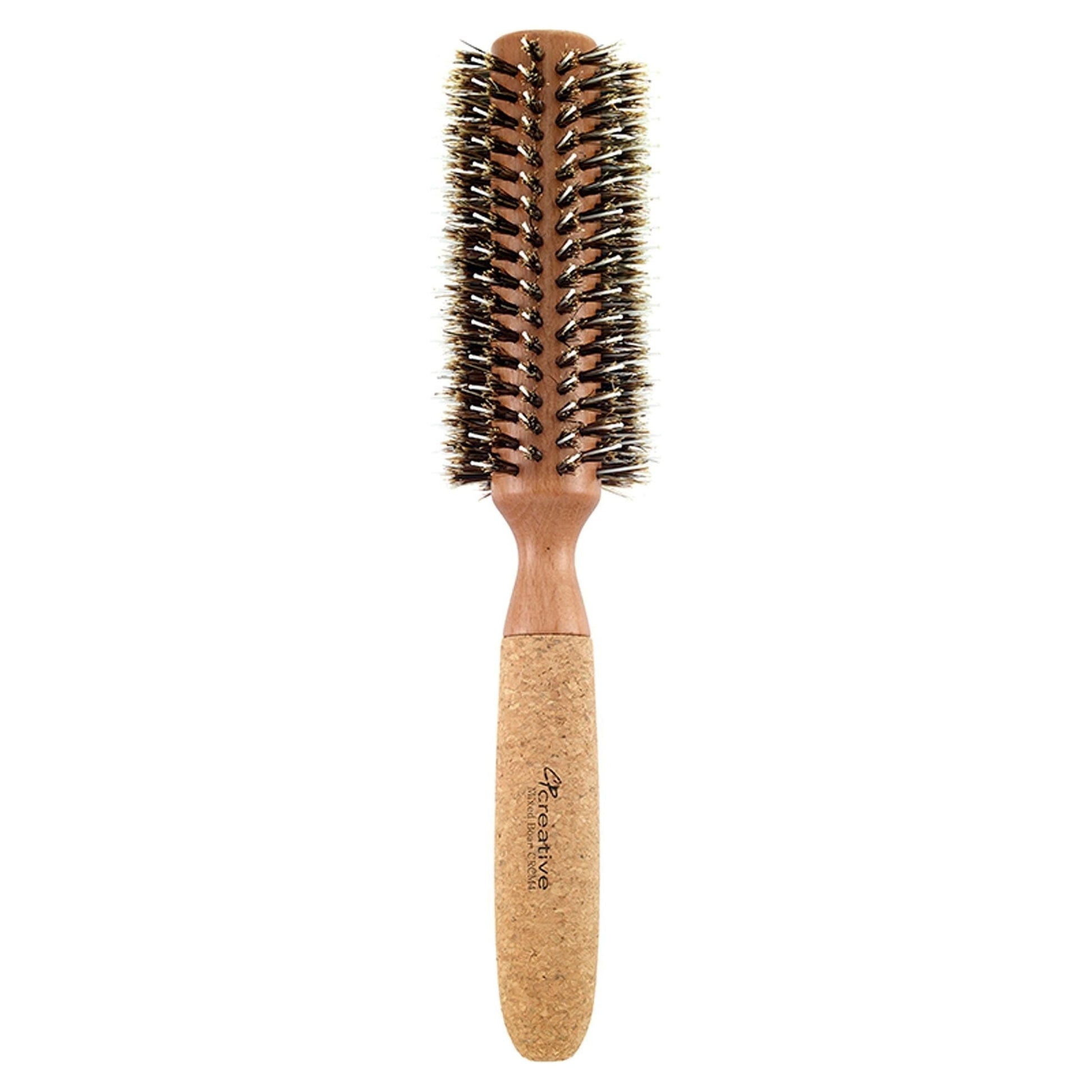 Eco-Friendly Birchwood and Cork Mixed Bristle Round Hair Brush by Creative Pro Hair Tools. Natural boar bristle hair brush is ergonomically designed with a cork handle to provide comfort while you style and limit stress on your hands and shoulders. Additionally, because the boar bristles naturally stimulate the scalp’s production of oil, you can enjoy smooth, shiny hair and a polished blowout every time you use this eco-friendly brush.
