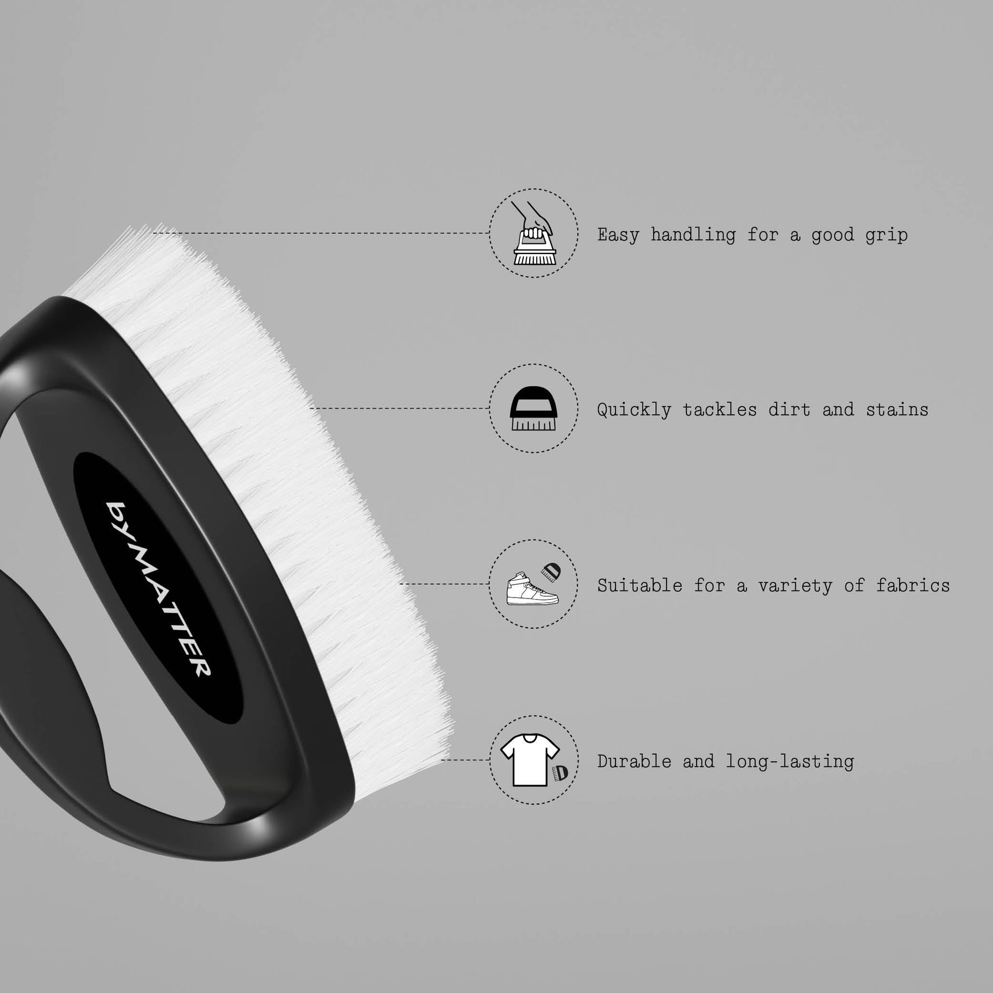 Ergonomic Brush designed to tackle dirt and stains on clothes and shoes.