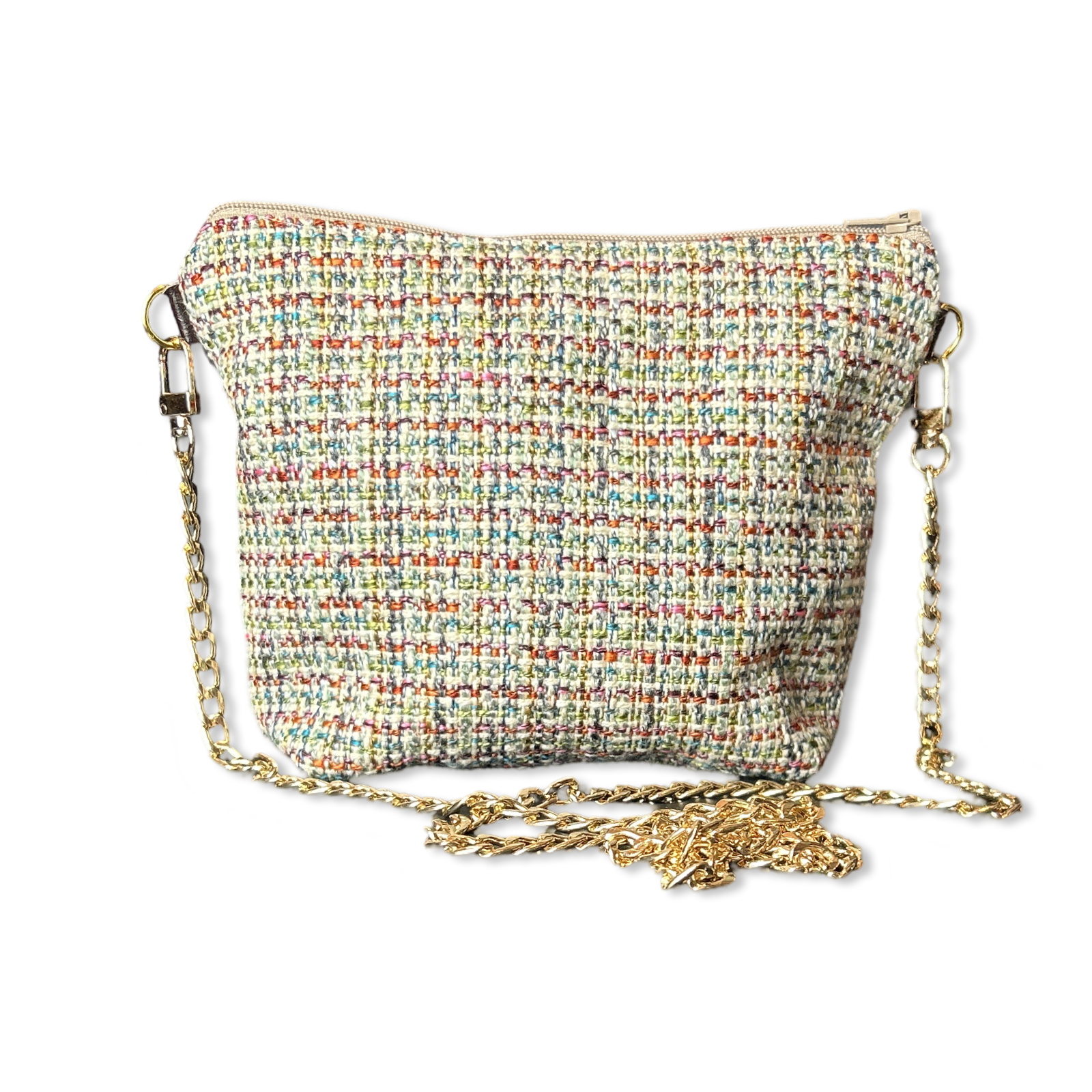 Vintage Gucci 100% silk scarf front paired coordinating tweed reverse. Fully lined with zipper closure and removable 23" drop gold-tone crossbody chain.