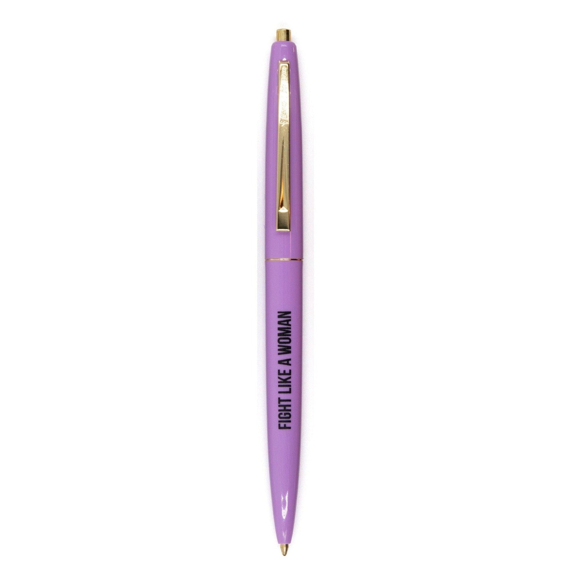 This pretty purple pen reads: "FIGHT LIKE A WOMAN" in black lettering and writes smoothly in black ink.