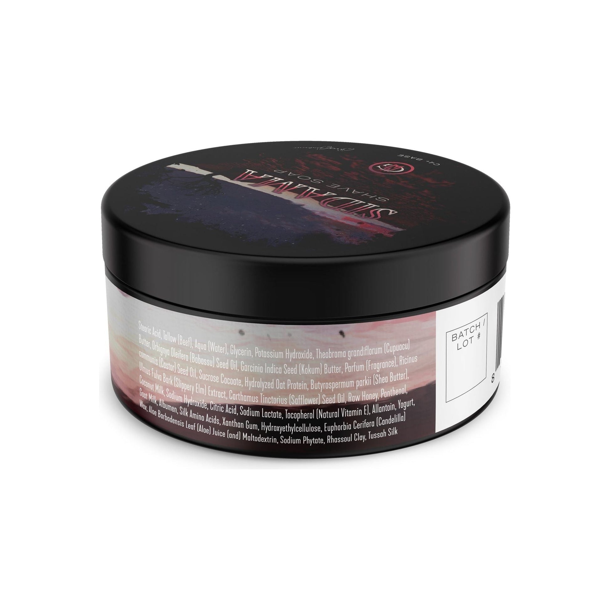 Shaving Soap Ingredients: Stearic Acid, Tallow (Beef), Aqua (Water), Glycerin, Potassium Hydroxide, Theobroma grandiflorum (Cupuacu) Butter, Orbignya Oleifera (Babassu) Seed Oil, Garcinia Indica Seed (Kokum) Butter, Parfum (Fragrance), Ricinus communis (Castor) Seed Oil, Sucrose Cocoate, Hydrolyzed Oat Protein, Butyrospermum parkii (Shea Butter), Ulmus Fulva Bark (Slippery Elm) Extract, Carthamus Tinctorius (Safflower) Seed Oil, Raw Honey, Panthenol, Coconut Milk, Sodium Hydroxide, Citric Acid, Sodium Lactate, Tocopherol (Natural Vitamin E), Allantoin, Yogurt, Goat Milk, Albumen, Silk Amino Acids, Xanthan Gum, Hydroxyethylcellulose, Euphorbia Cerifera (Candelilla) Wax, Aloe Barbadensis Leaf (Aloe) Juice (and) Maltodextrin, Sodium Phytate, Rhassoul Clay, Tussah Silk.