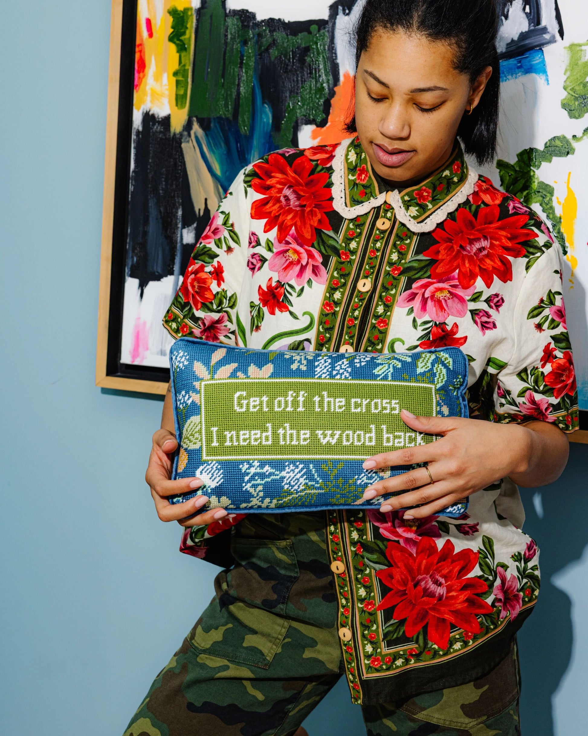 For the ones who know that martyrdom is overrated. This pillow is for those who say, ‘Get off the cross, I need the wood back,’ because the drama’s unnecessary, and the materials could be put to better use.