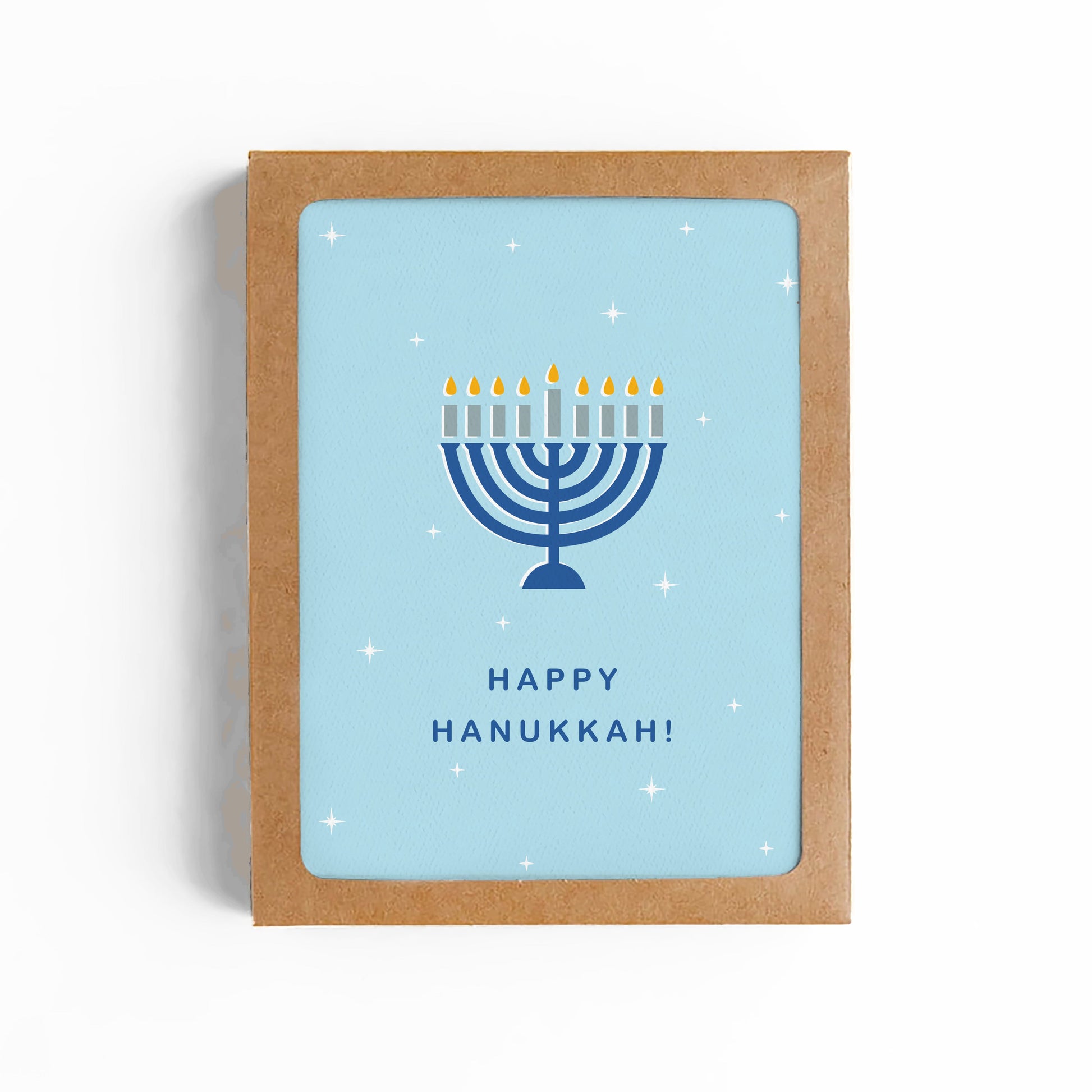 A modern Happy Hanukkah card with a simple illustration of a Menorah.