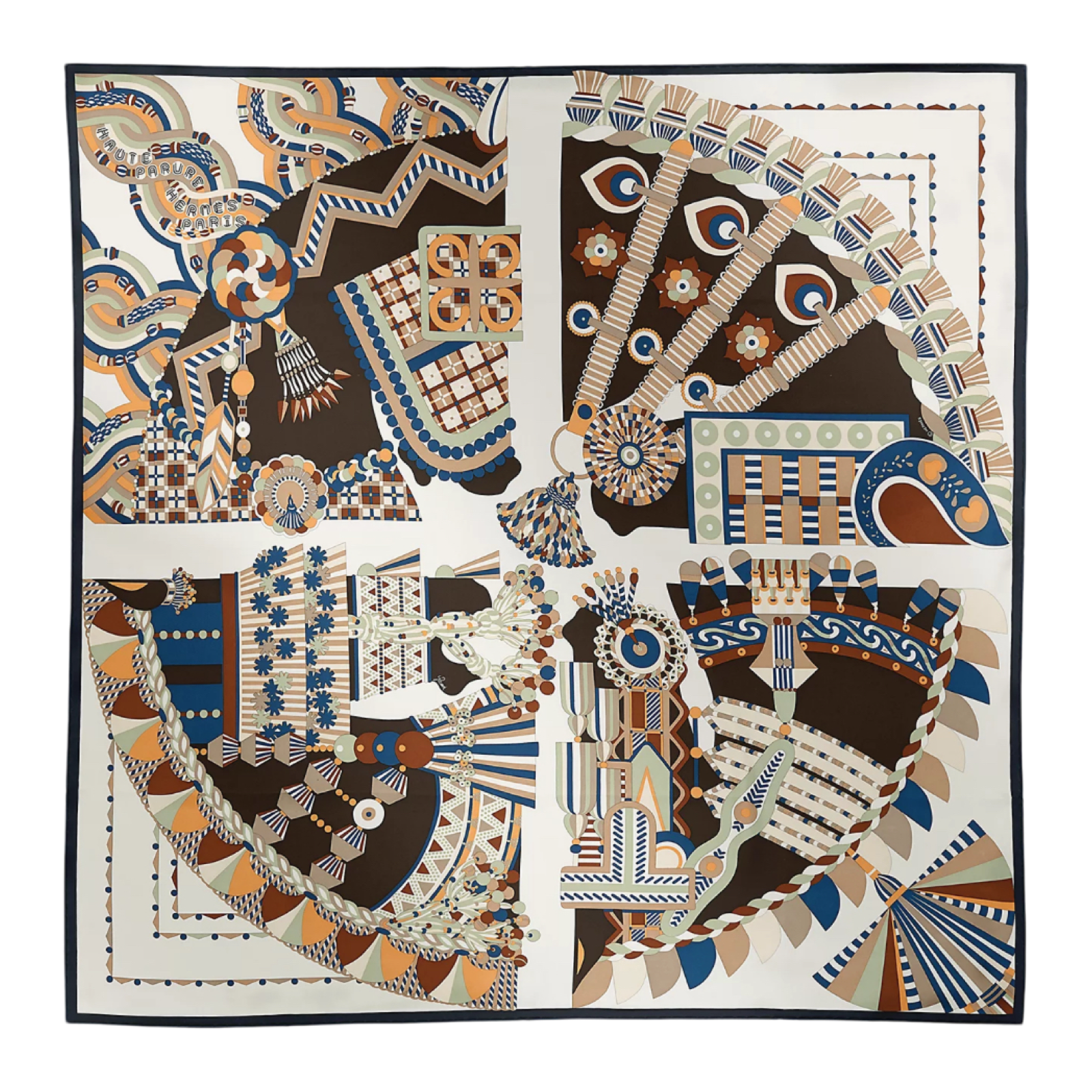 The Hermès"Haute Parure scarf, designed by Virginie Jamin, tells a story of equestrian finery and vibrant design. It features a captivating circle of intricately arranged buckles, bridles, bows, and tassels. The scarf embodies the powerful beauty and charismatic femininity that Hermès scarves are known for.