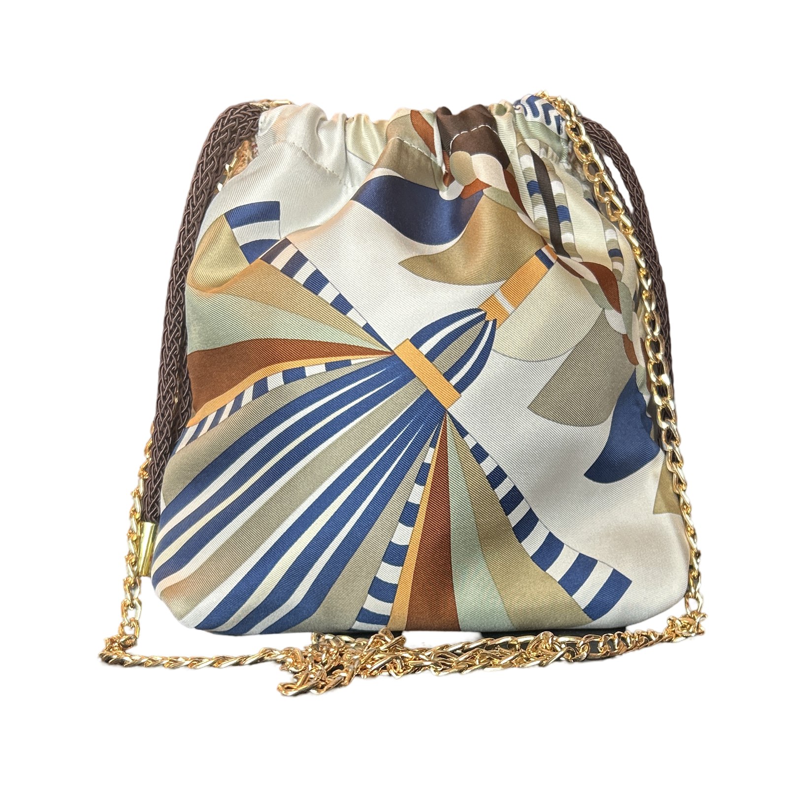 Reimagined from the world’s finest collection of vintage Hermès scarves, our drawstring bag is the ultimate accessory for your on-the-go lifestyle. Uniquely convertible from a crossbody to a handheld bag with both goldtone chain and silky drawstring cord.