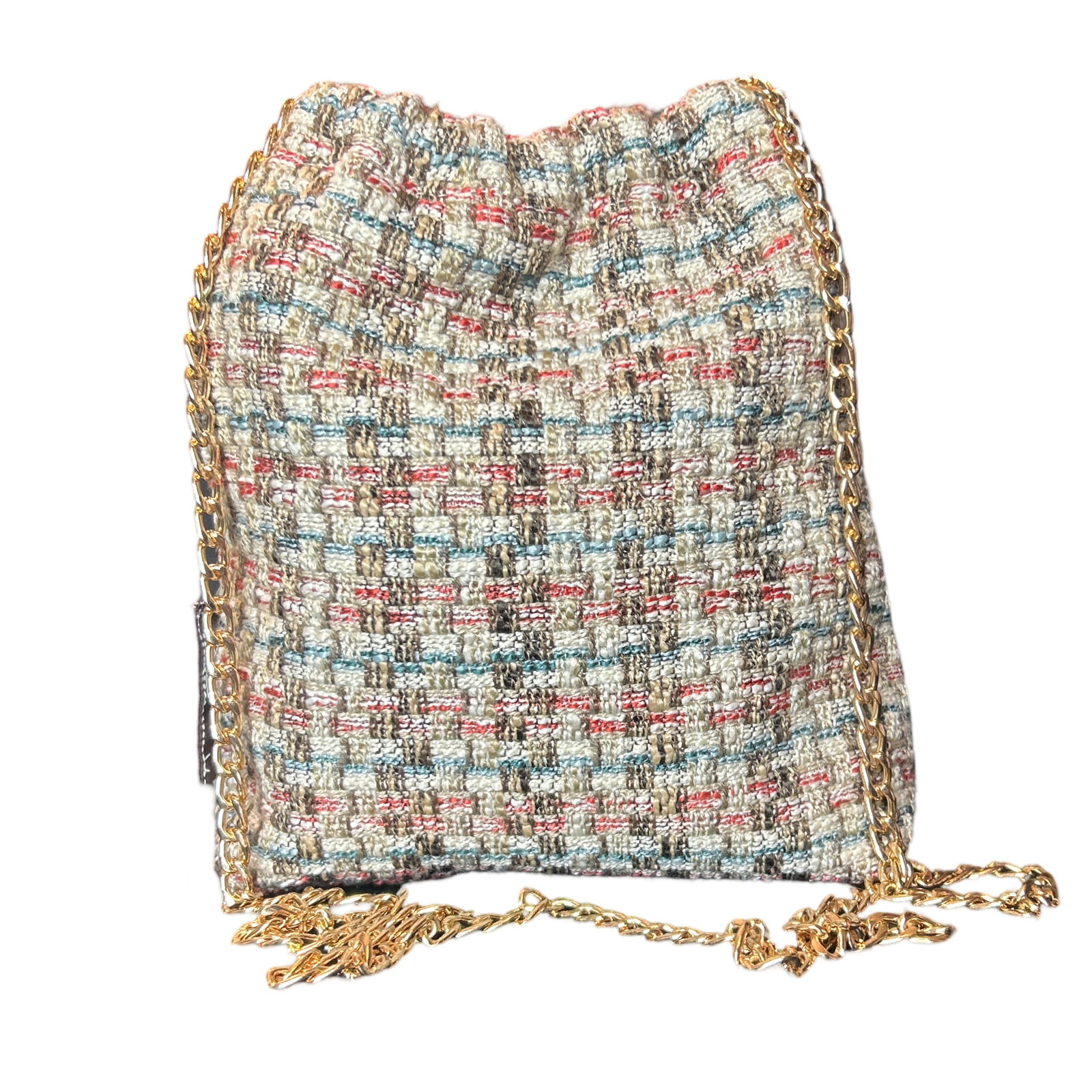 Vintage Hermes Haute Parure silk scarf front paired with coordinating stipe tweed reverse. Fully lined with internal pocket, silken drawstring cord closure and removable 23" drop gold-tone crossbody chain.