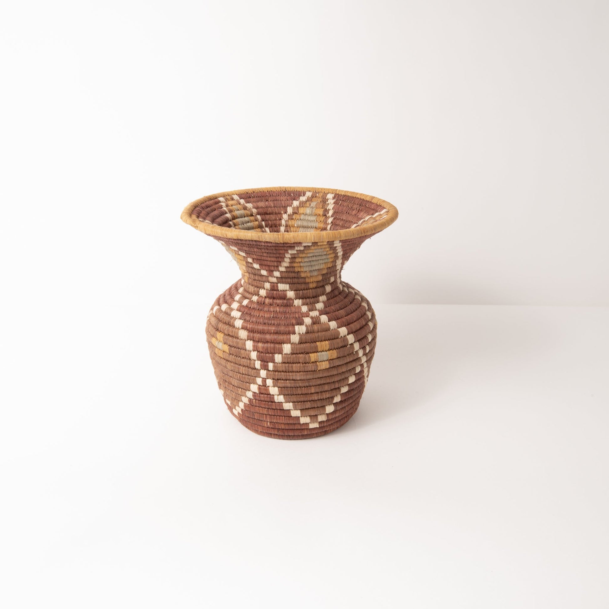 Create a stunning arrangement of dried flowers and grasses or add a glass cylinder filled with water for a bouquet of your favorite fresh cut flowers. This durable and artistically woven vase is beautiful as a canterpiece or on a mantel and woven in the rich color palette of our Elevate Collection, the 2025 annual small batch basket collection.