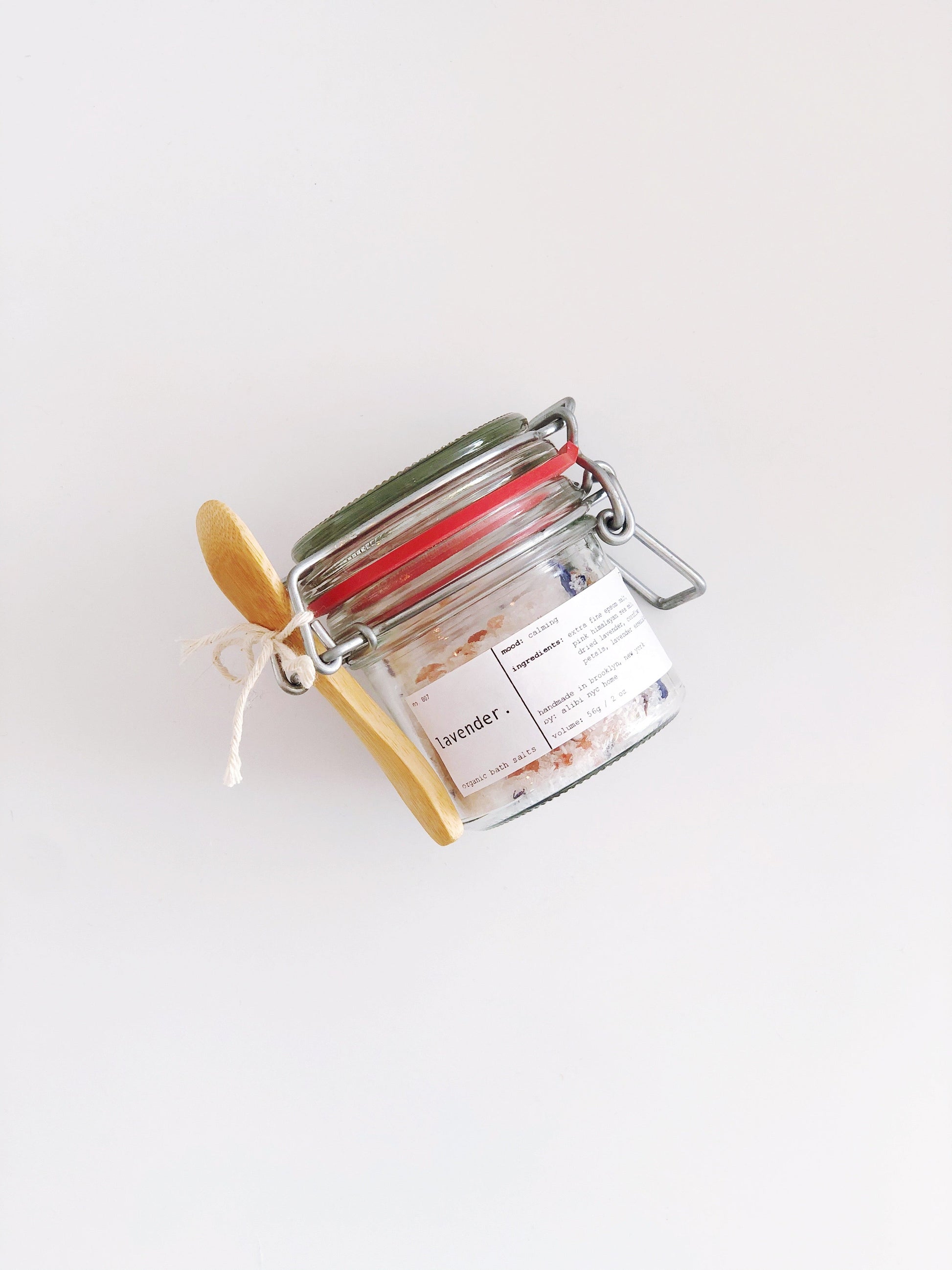 | INGREDIENTS: EPSOM SALT, PINK HIMALAYAN SEA SALT, BULGARIAN LAVENDER ESSENTIAL OIL AND DRIED LAVENDER. |