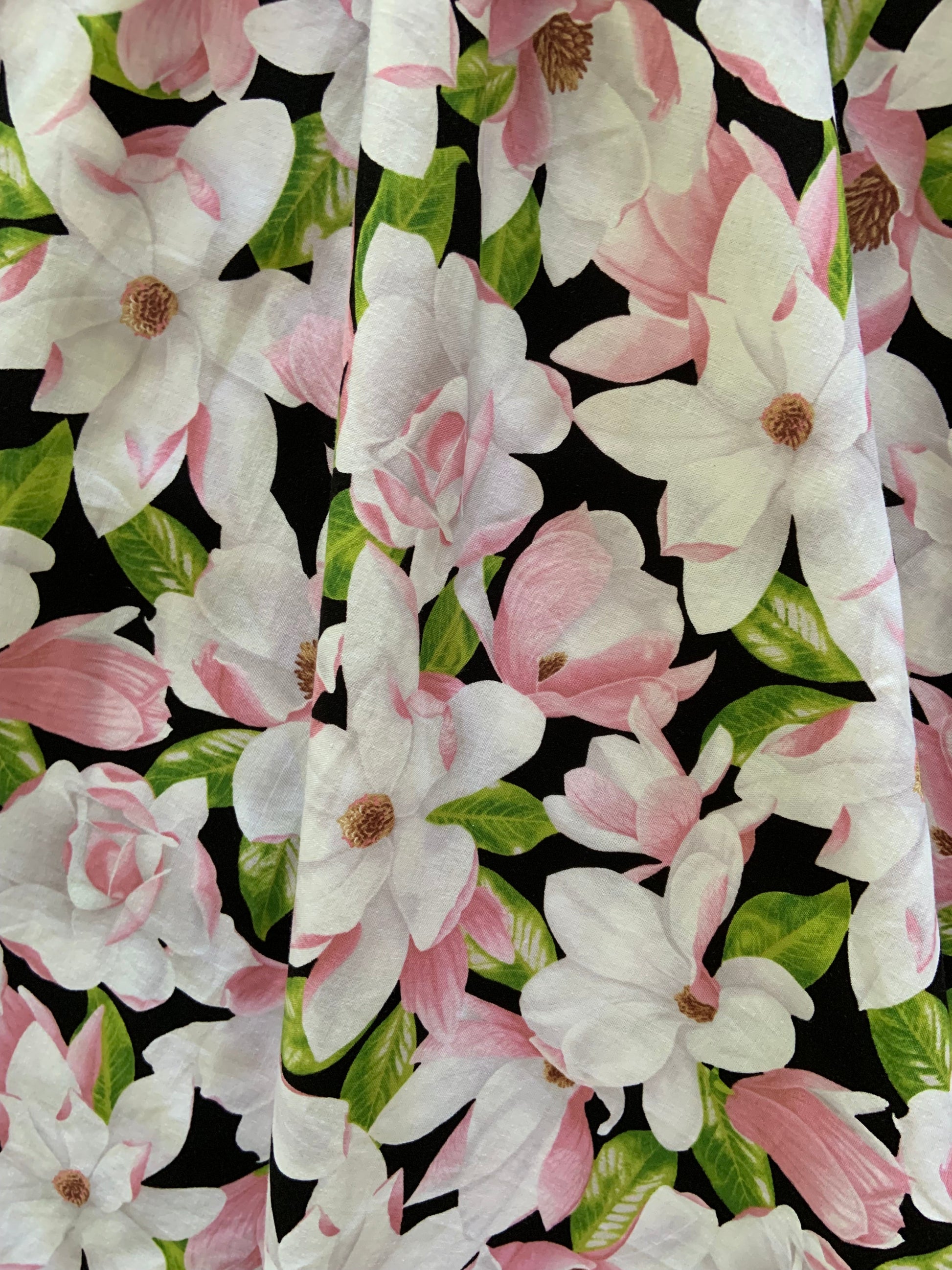 A vintage style piece with fun, modern details; our midi dress is now available in our pretty magnolia print. Made from 100% cotton, this classic 1950's inspired dress features a high neckline, longer length swing skirt with hidden side pockets, and back zippered closure.