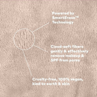 Erase all makeup with JUST WATER™ including waterproof + SPF. Our patented, water-activated, cloud-soft fibers gently & easily remove all makeup & sunscreen from pores. 2 in 1 benefit: one side erases makeup & one side exfoliates skin.