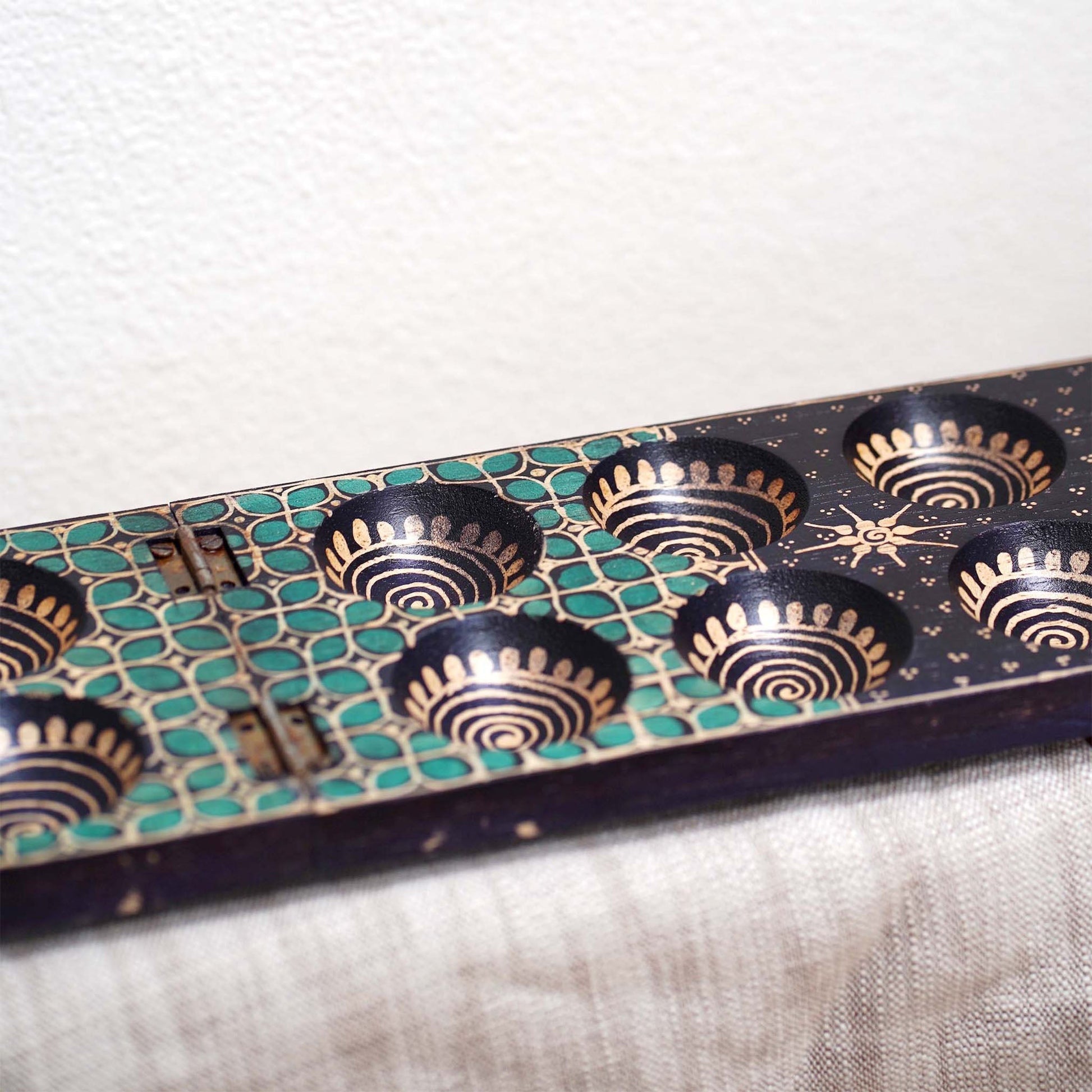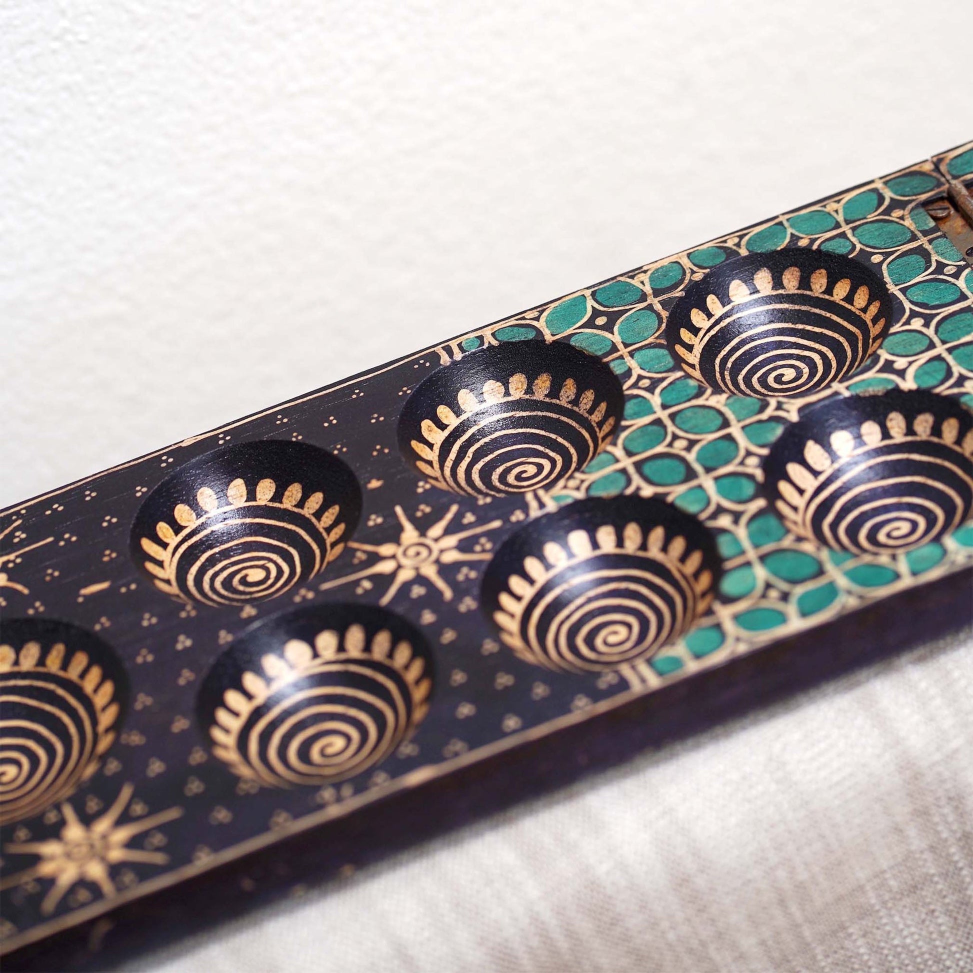 - Our mancala board is handcrafted from albacia wood; which our artisans then hand-drawn using canting tool with hot wax; before submerging the whole wood to dye and color the pattern.