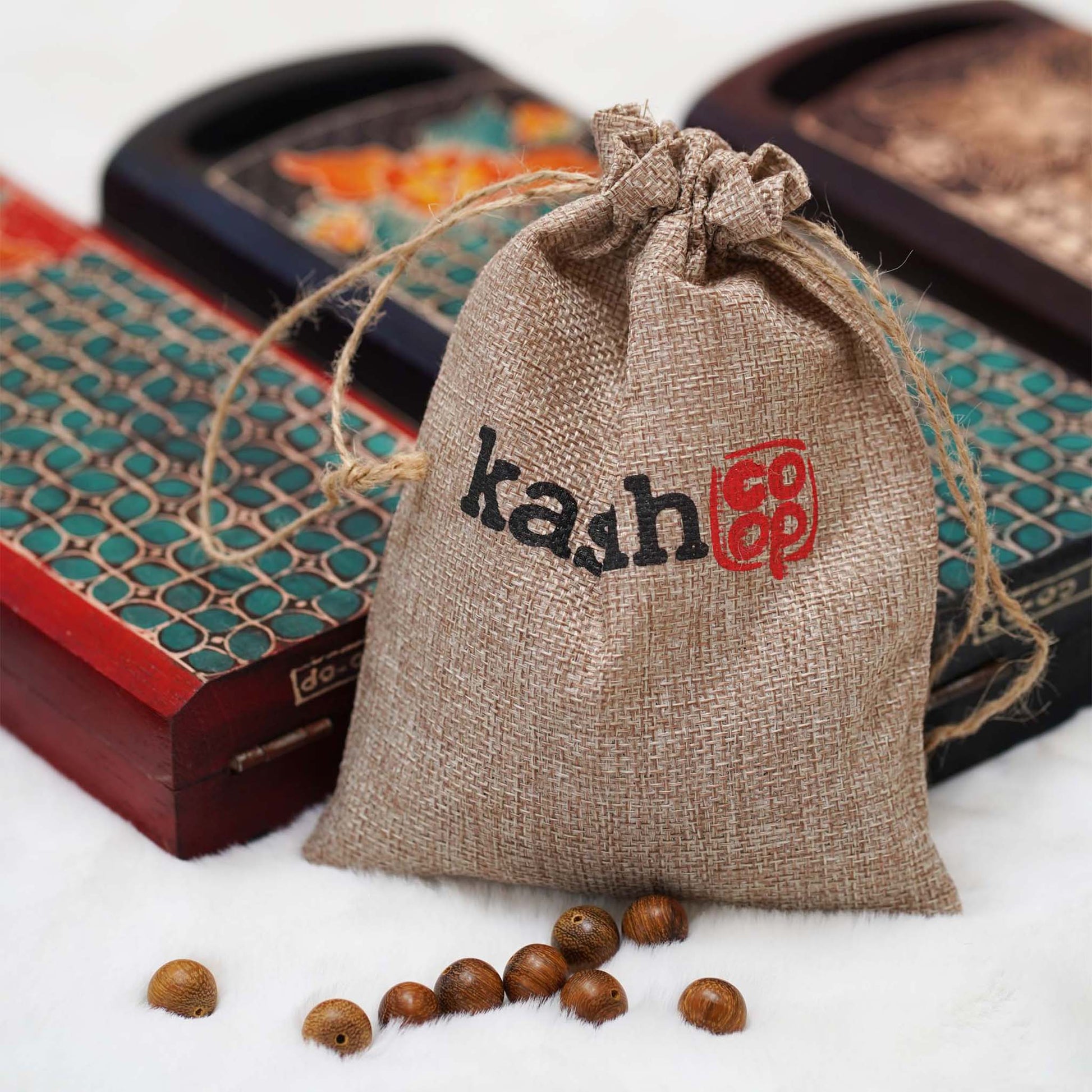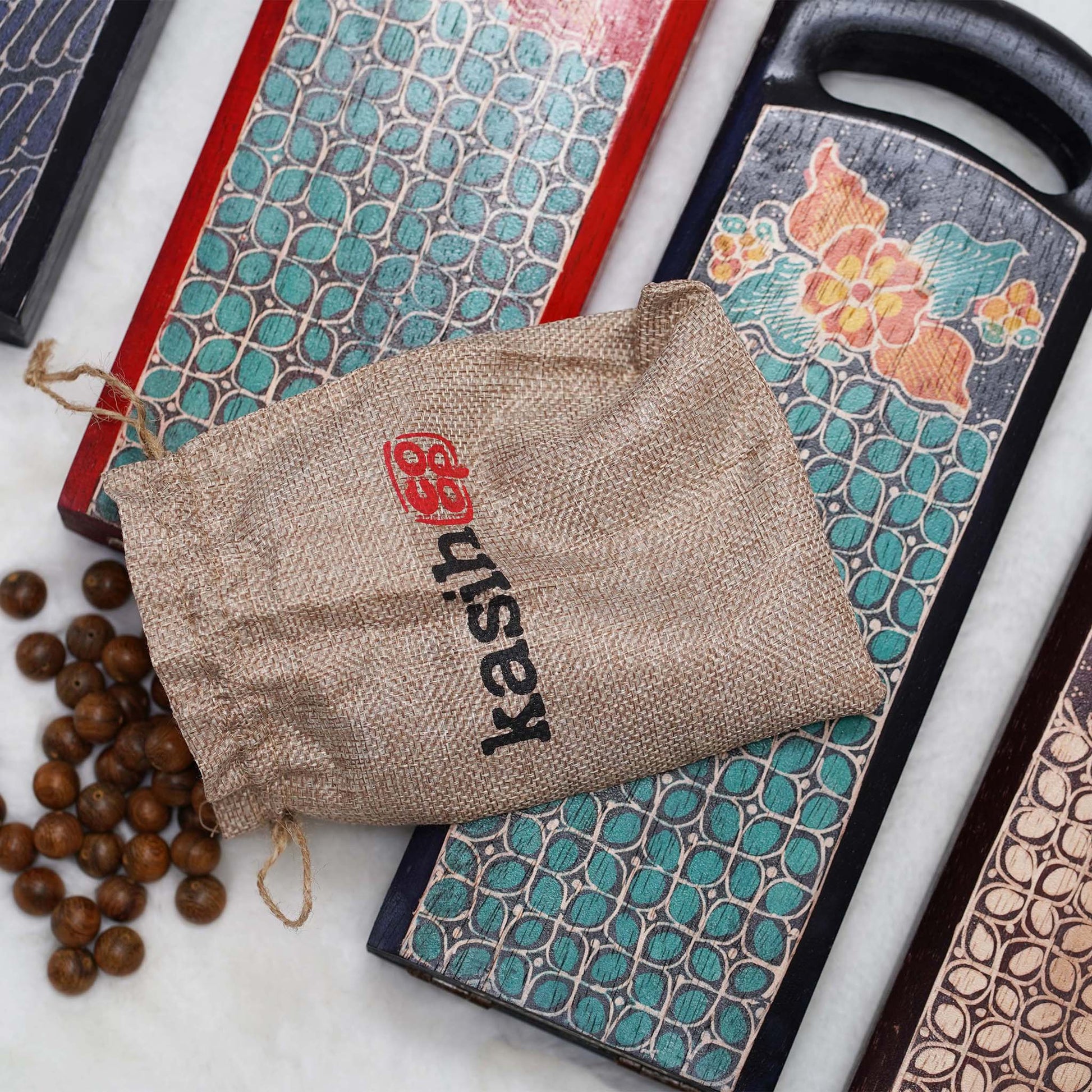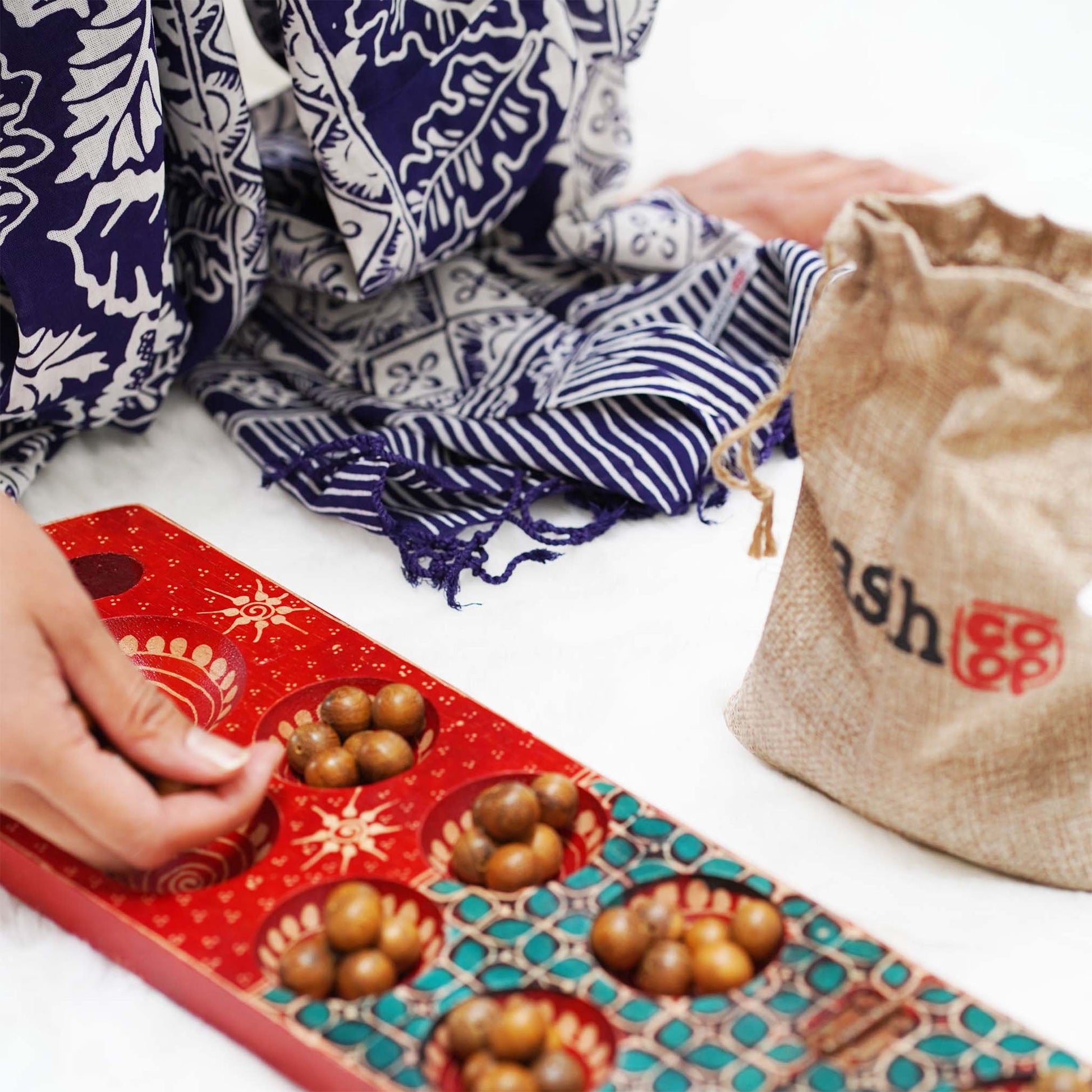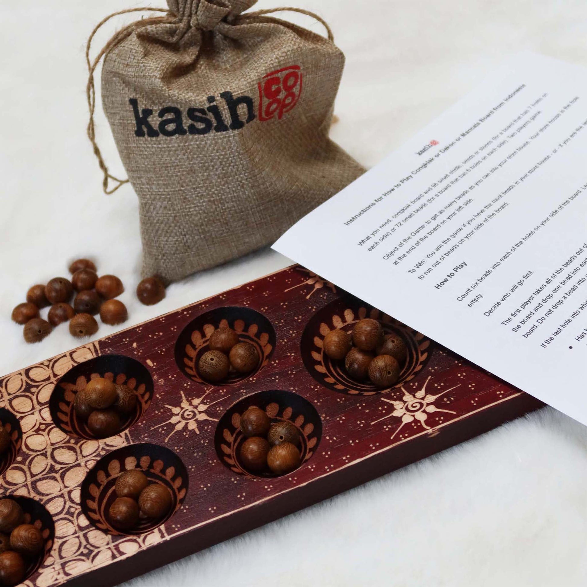 Handmade Albacia wood mancala, dakon, congklak made by our artisans in Indonesia. Sold with wooden beads in our branded Kasih Co-op pouch jute bag along with an instruction on how to play our mancala board game set.