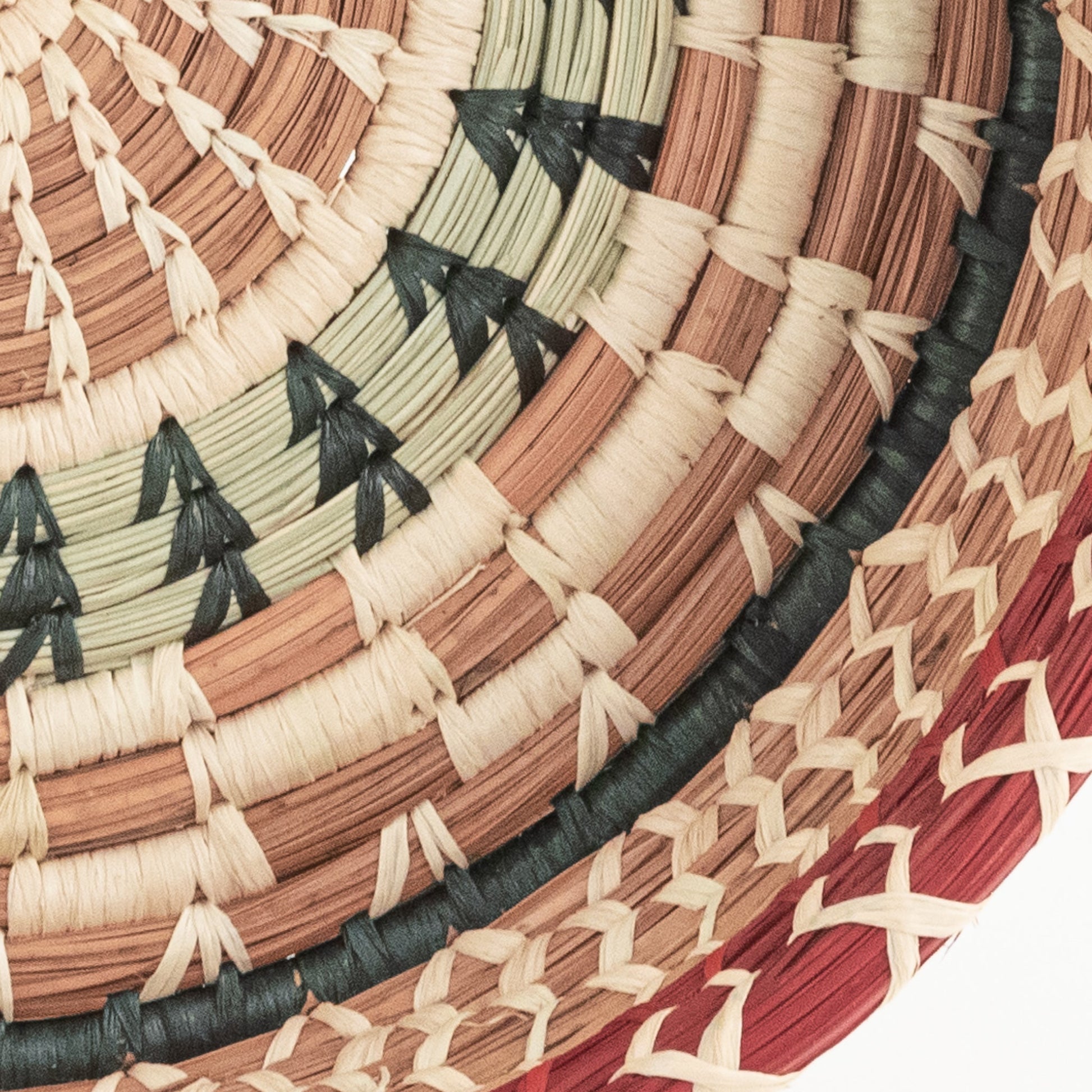 This checkered pine needle basket is made from pine needles and pajon, a native grass in Guatemala, with hand-dyed raffia for colorful accents. Pine needles, native grass, raffia 8 1/2"W at top, 8" W at base, and 2" high