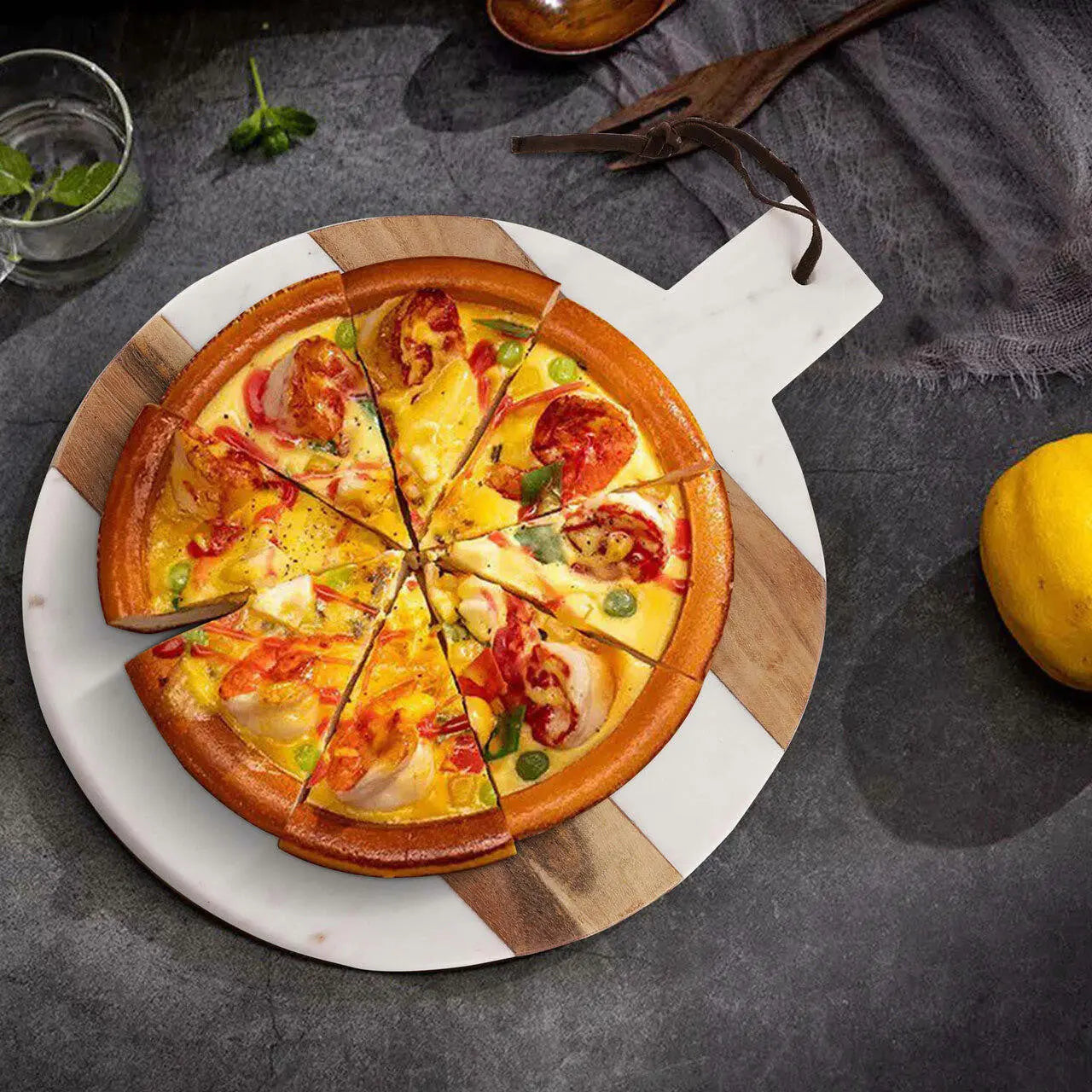 The Mez Round Marble Wood Paddle Charcuterie Board is perfect for prepping and presenting special treats. Crafted of beautiful white marble with warm acacia wood, this board easily transfers delectable hors d'oeuvres from the countertop to the table. When not in use, the Mez cutting board becomes an elegant decorative accent in your kitchen.