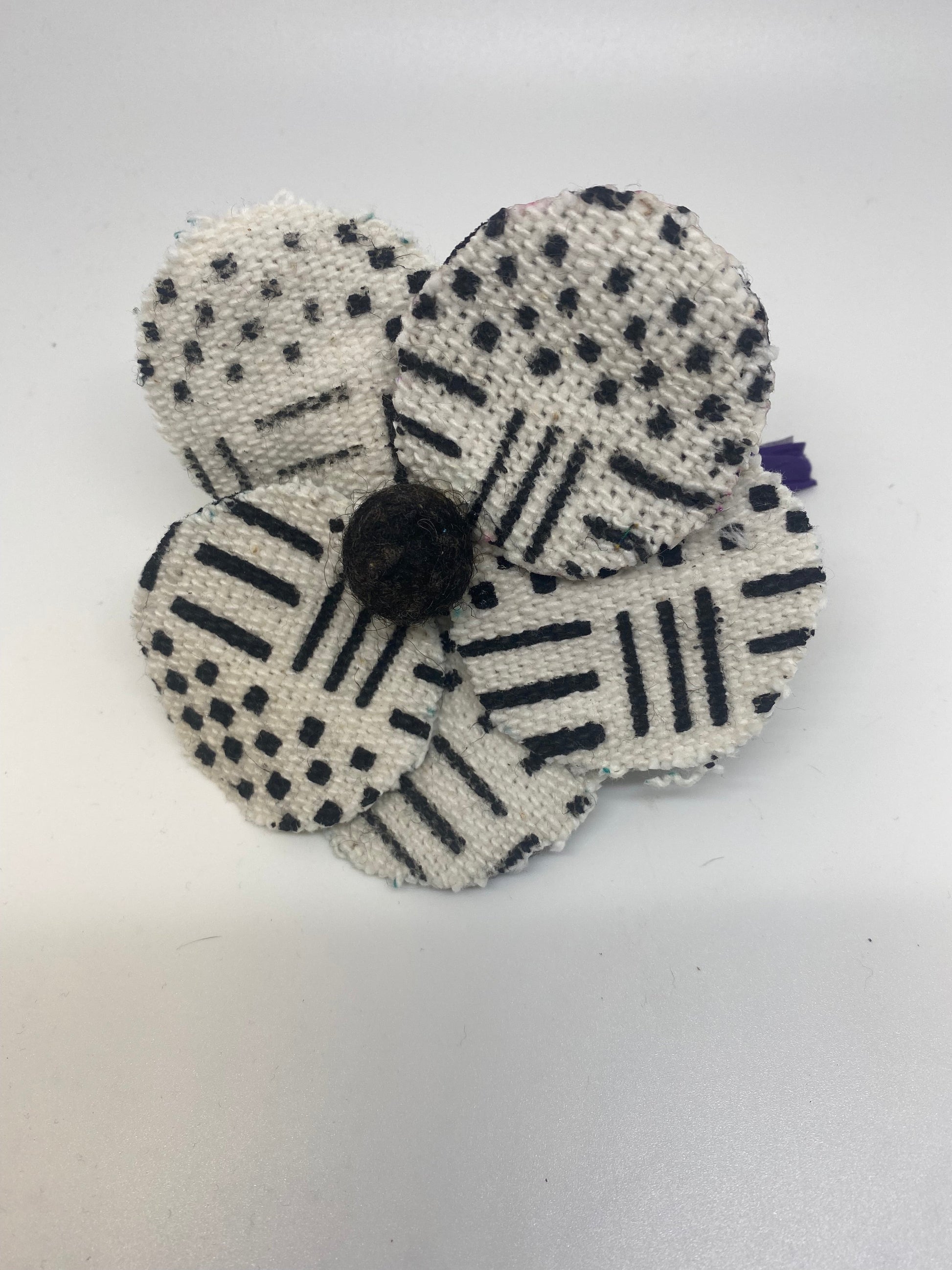 Make your own mudcloth flower! Mudcloth is a beautiful fabric made in Mali, West Africa, with 100% cotton strip cloth, woven on a traditional loom, and dyed with natural mud to make exquisite fabric. Mudcloth is celebrated for its rich traditional methods, right at home in contemporary design. We will make a simple fabric flower with this cloth, topped with a sweet little stamen made out of 100% wool, hand felted into a ball, made in Bolivia. These flowers make lovely hostess gifts, dress up your holiday table, or just bring joy into your home decor.
