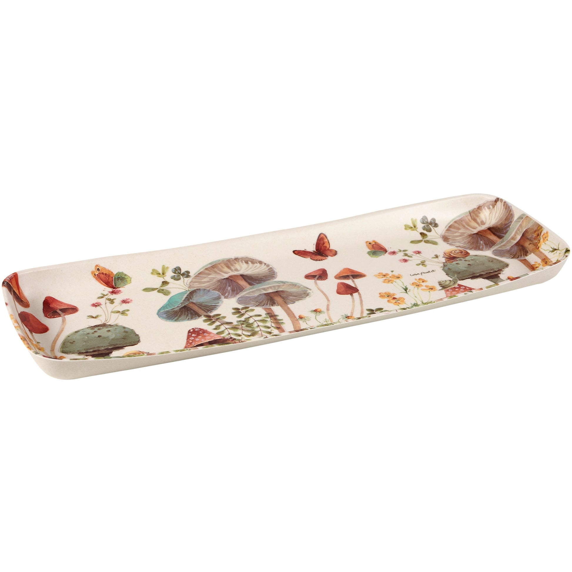 A long bamboo tray featuring a hand painted design of mushrooms, snails, and butterflies in a delicate watercolor style.