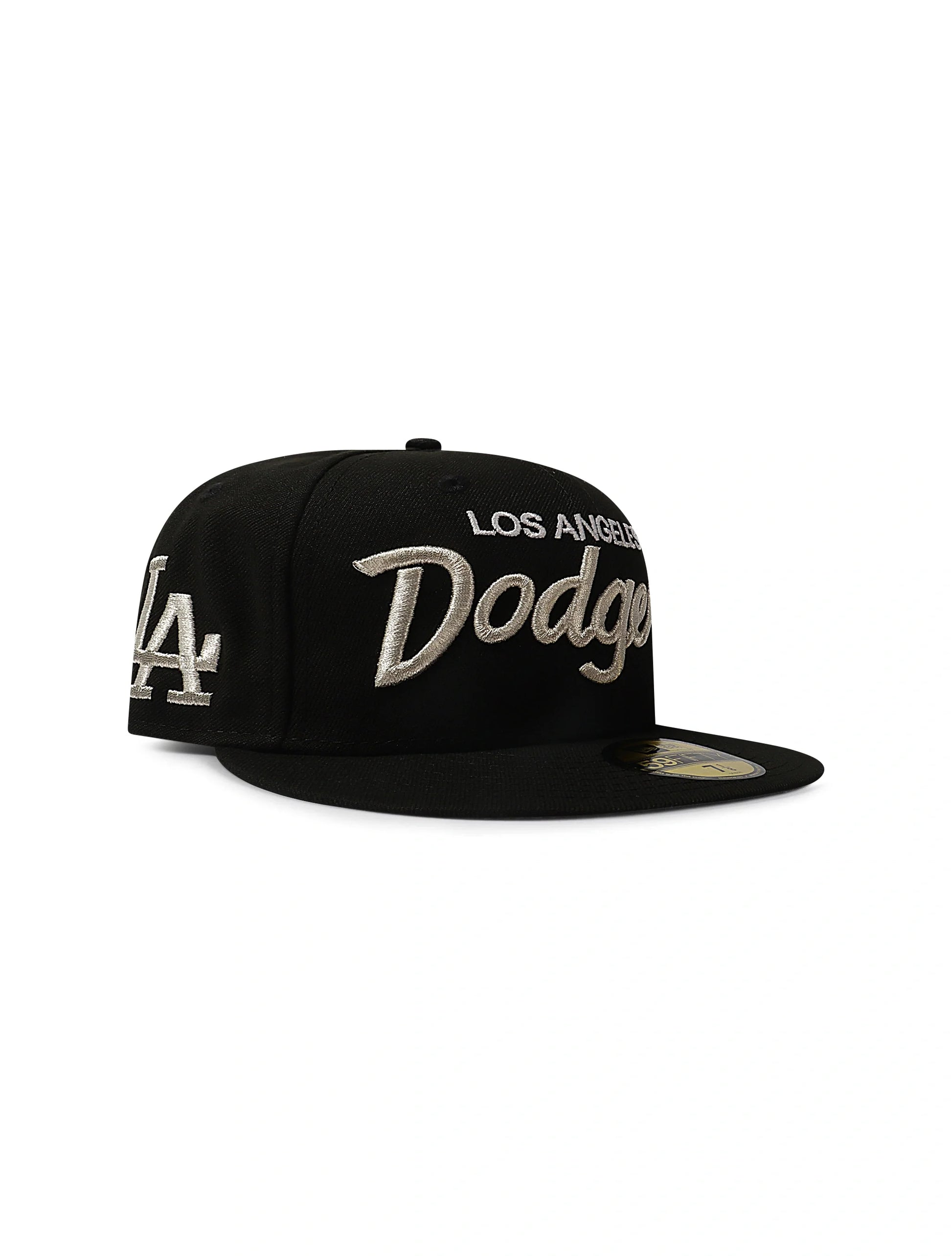 Showcase your team pride with the New Era 59FIFTY Dodgers Side LA Metallic Script Hat in Black/Silver. This fitted cap features bold metallic “Los Angeles Dodgers” script embroidery across the front and the classic LA logo on the side for a statement look that shines under any light. Crafted from high-quality materials with a flat brim and structured fit, it’s finished with the official MLB batterman logo on the back for authentic style.