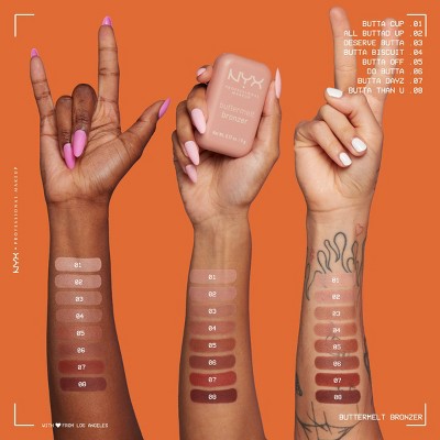 Butta bronze, butta blend, butta boom! NYX Professional Makeup Buttermelt Bronzer blends like powder and glides like butta. For a sun-soaked bronze all year round, and all day long. Up to 12 hours of wear. In 8 buttalicous true to skin shades infused with mango butter, shea butter, and almond butter.