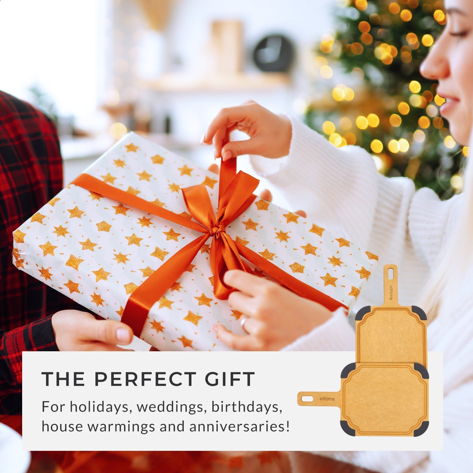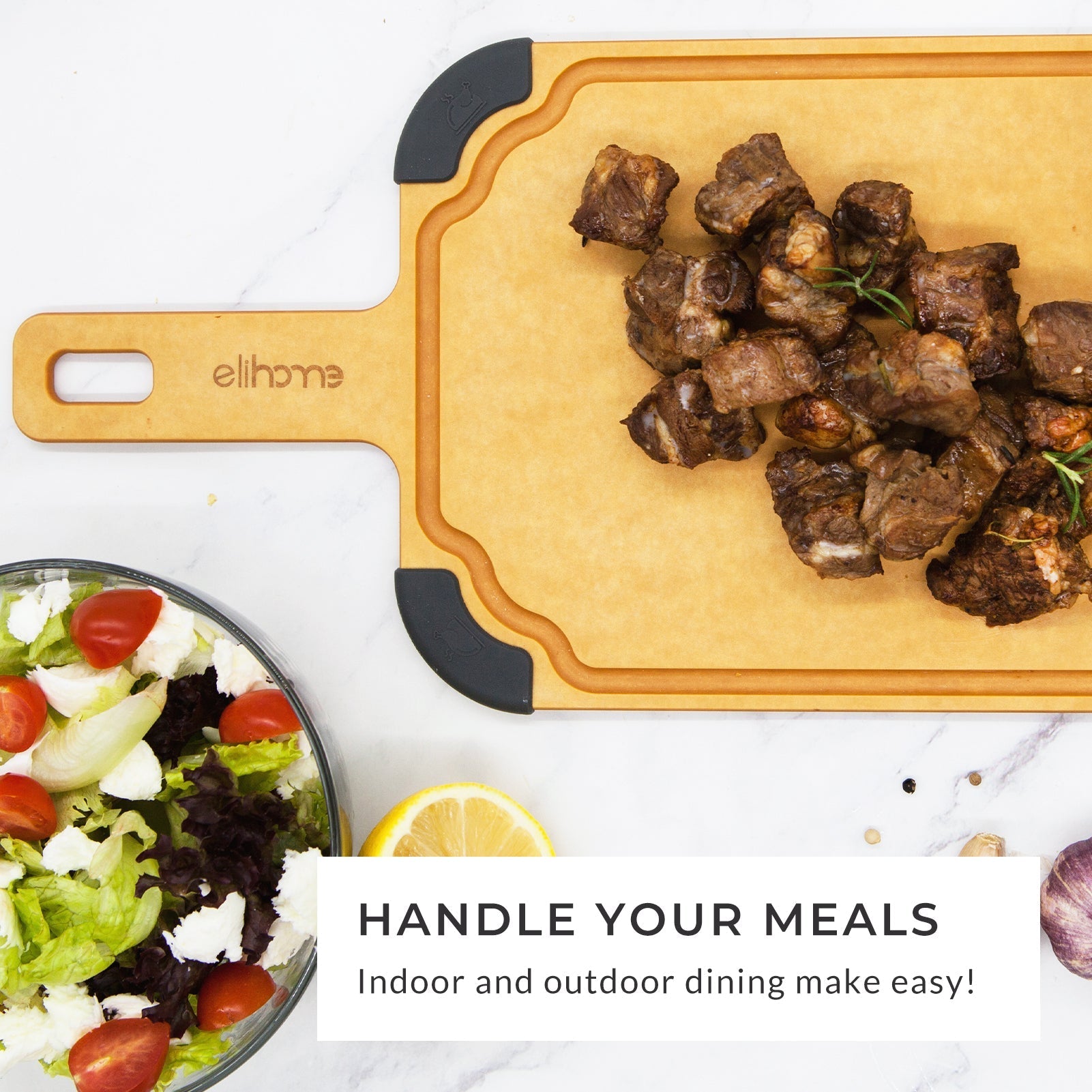 Crafted from high-density pine leaf fiberwood, this cutting board is a sustainable, eco-friendlychoice for your kitchen. Its reversible, double-sided design allows you to switch between surfaces for different food types, enhancing food safety while reducing your carbon footprint.