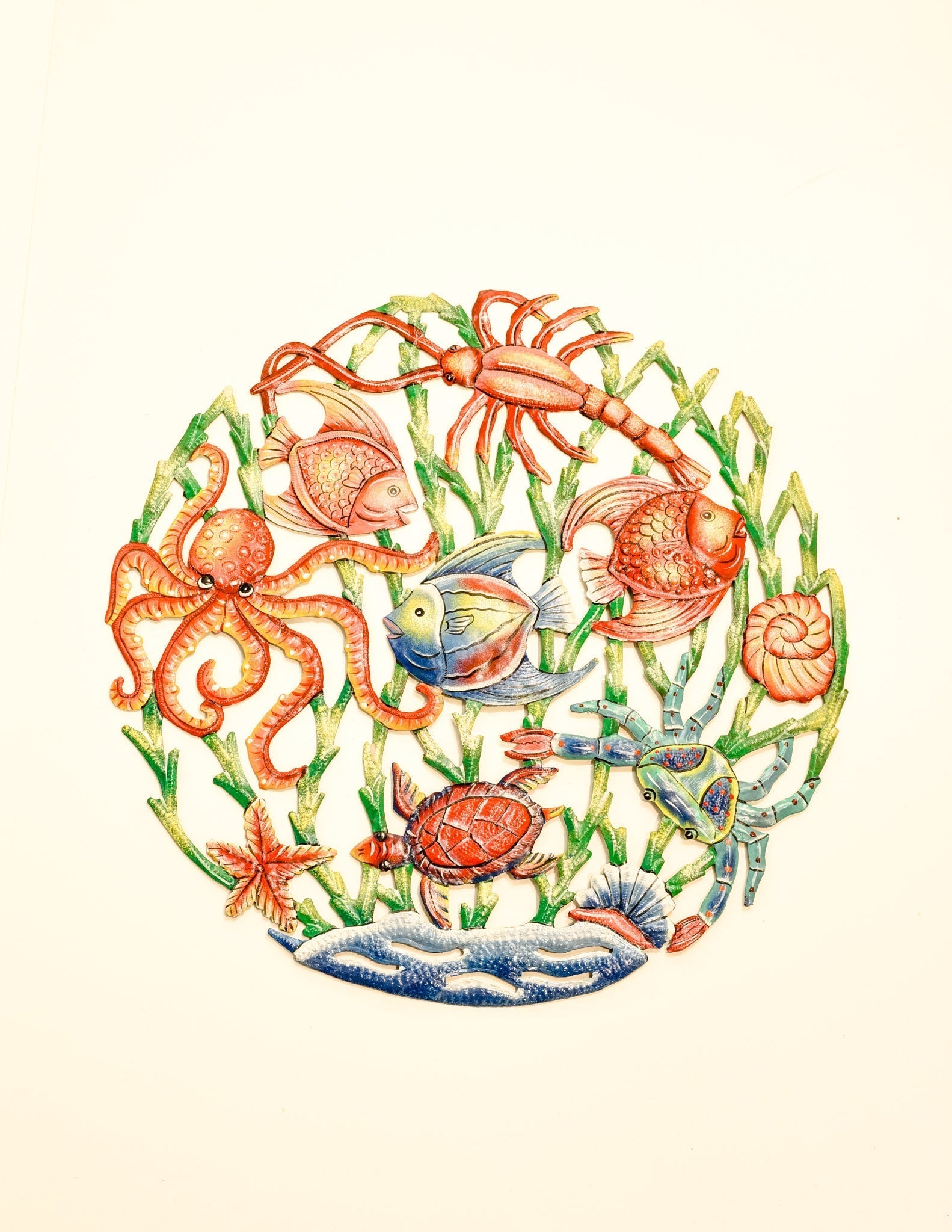 Painted Playmates in the Sea is a‚ one-of-a-kind Haitian metal art masterpiece made for indoor and outdoor decorative use. A gorgeously‚ detailed and vibrantly painted sea-themed piece,‚ Painted Playmates in the Sea will make a statement in any beach or coastal home.