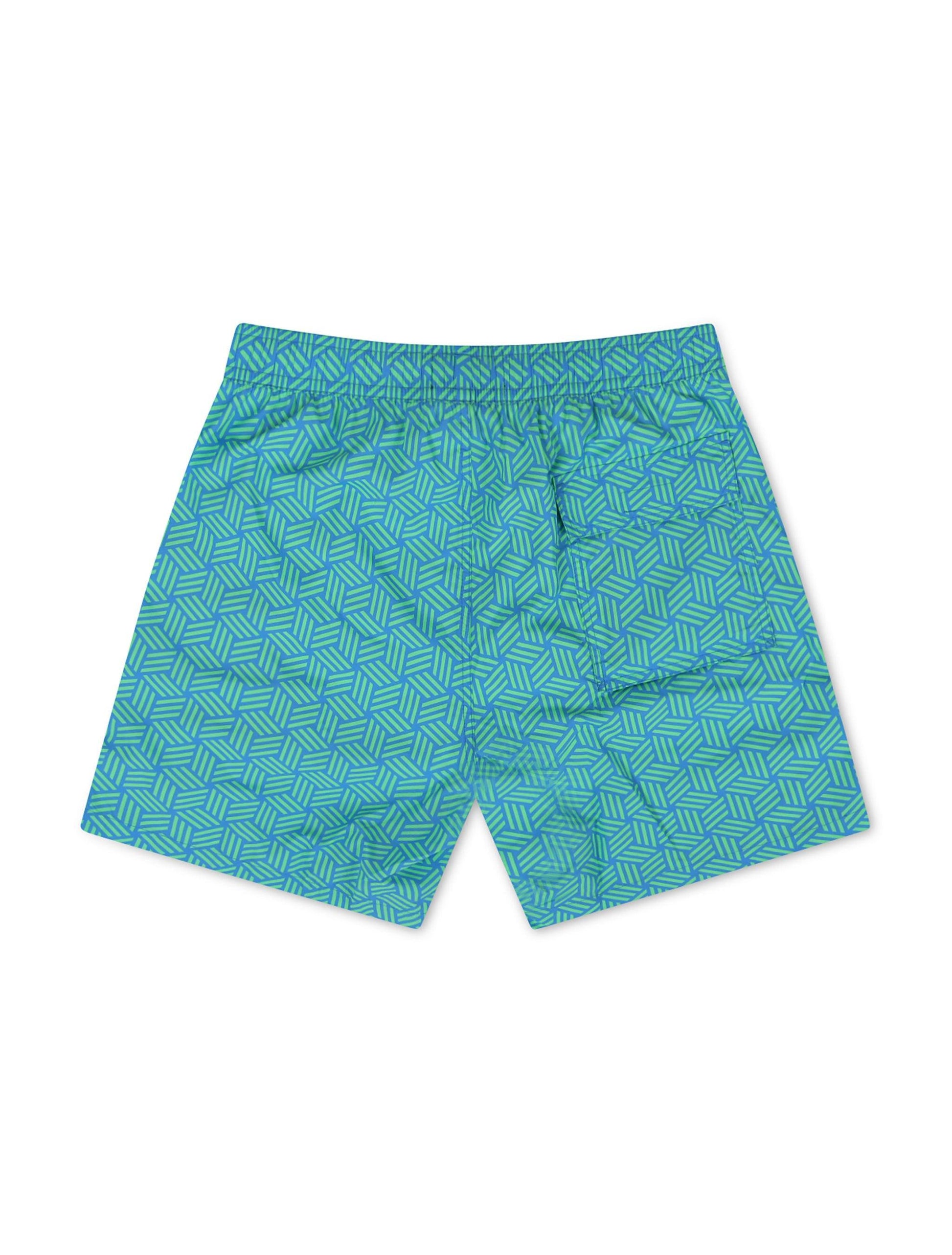 Recycled poly swim trunk with drawstring and mesh lining for comfort. Comes with waterproof bag in back pocket. Geometric-print adds beach vibes.
