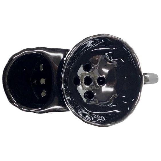 This is a Simpsons barber shaving scuttle in the traditional style. The shallow holder with drain holes at the top holds a puck of shaving soap. Through the wide spout on the side, the mug can be filled with boiling hot water from a tea kettle. The shaving brush can then be dunked into the water through the spout to heat it up before swishing it around on the soap on the top. This creates warm lather for shaving. The drain holes allow excess water to drain back into the mug and keep the hard soap from dissolving. The water will hold enough heat for a comfortable shave.