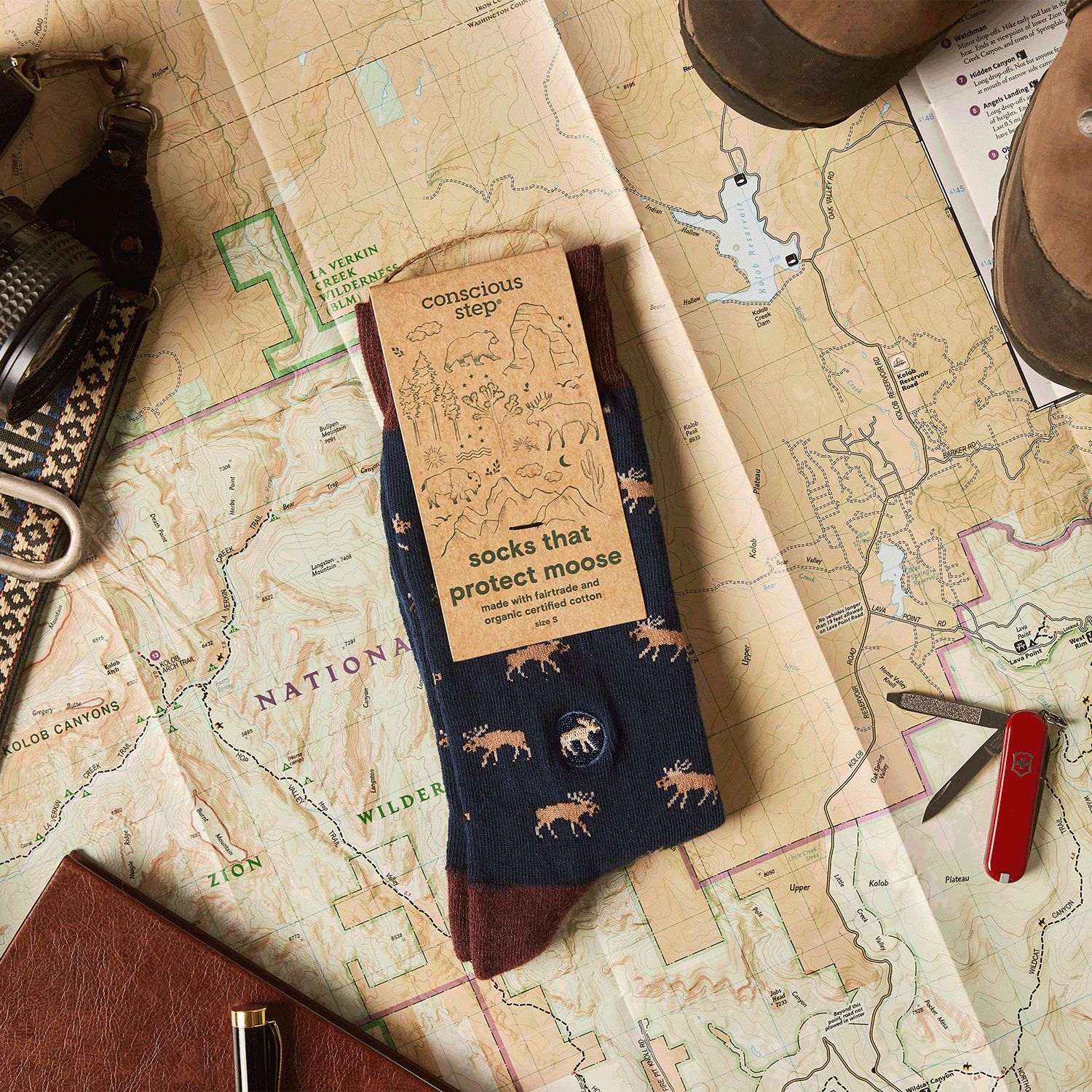 We herd you’re the outdoorsy type… so step out in style in this navy and maroon moose pair and hit the trails, just like our northern moose friends!