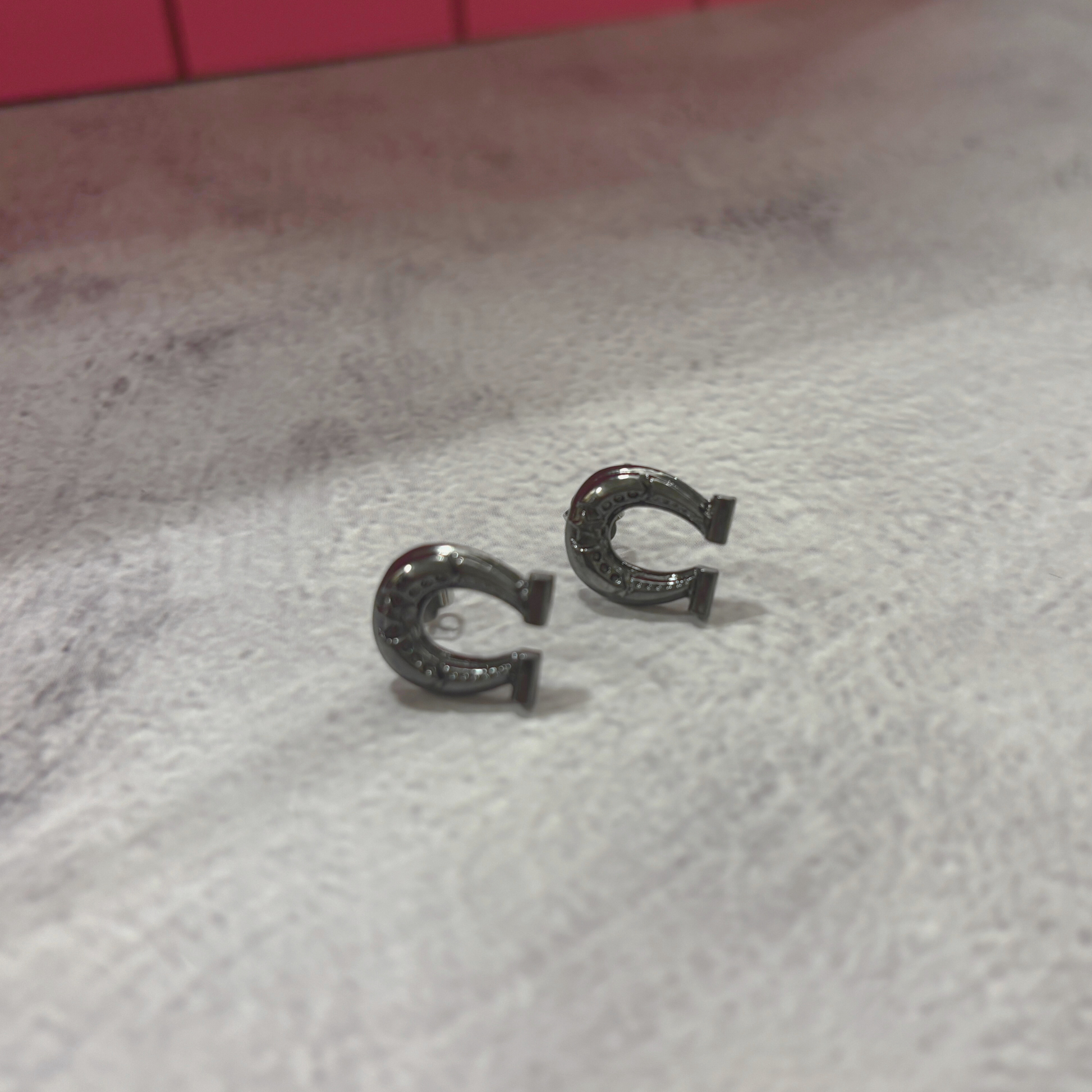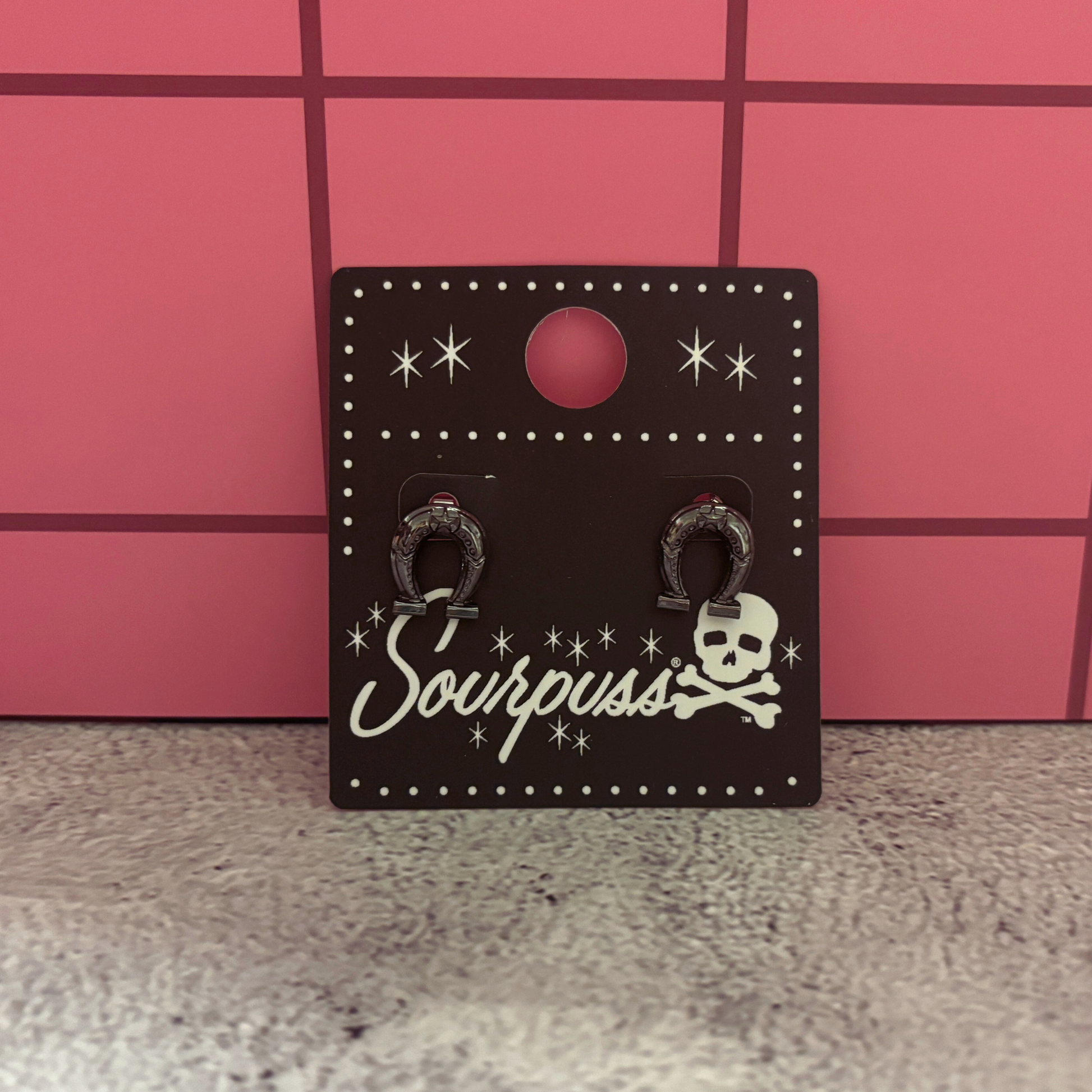 Sourpuss Earrings | Horseshoe Studs Black Gunmetal | Rockabilly Lucky Charm Jewelry