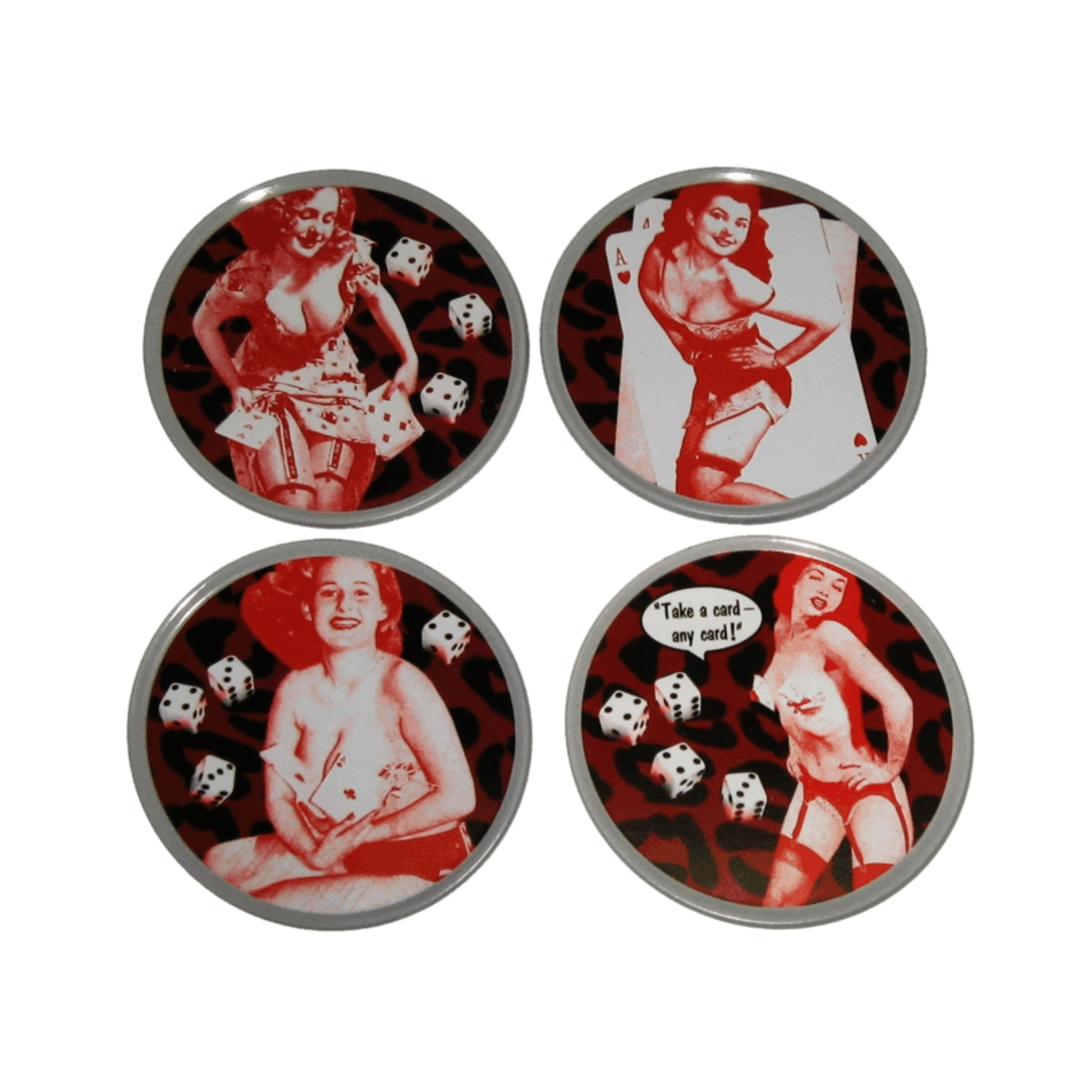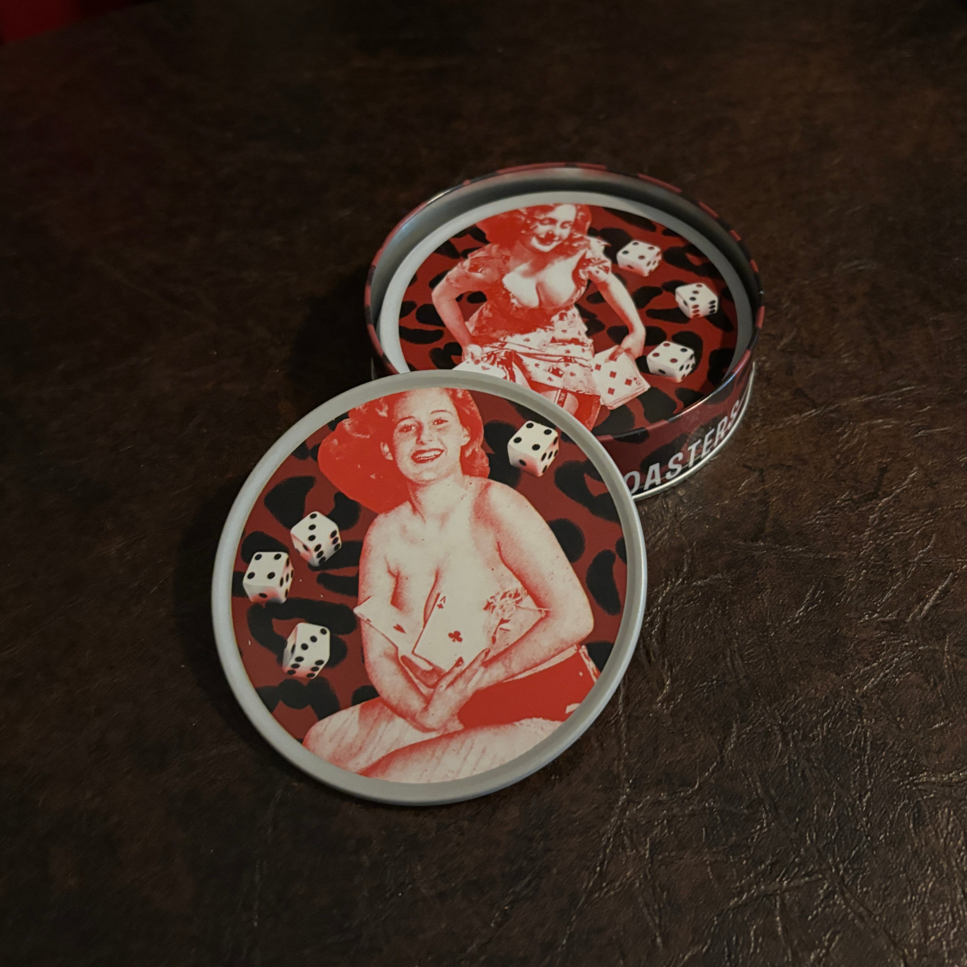 Sourpuss Nudie Coasters | Rockabilly Pin-Up Girls Set of Four | Metal & Cork Retro Drinkware with Storage Tin