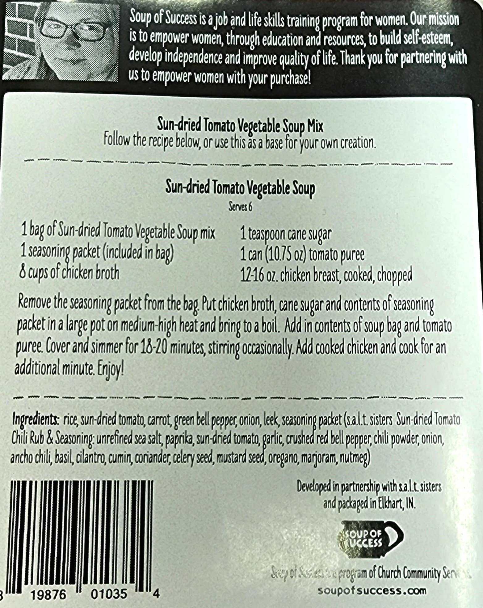 Soup Of Success is an empowerment program for women dealing with difficult life situations. They are involved in classes and counseling and run this social enterprise that makes delicious, gourmet, healthy soup mixes. All proceeds from sales of Soup Of Success products are used to pay training wages for women in the program. Not only are they amazing products, but it's an amazing life changing life line for women learning to live their best life! Thank you for your support.