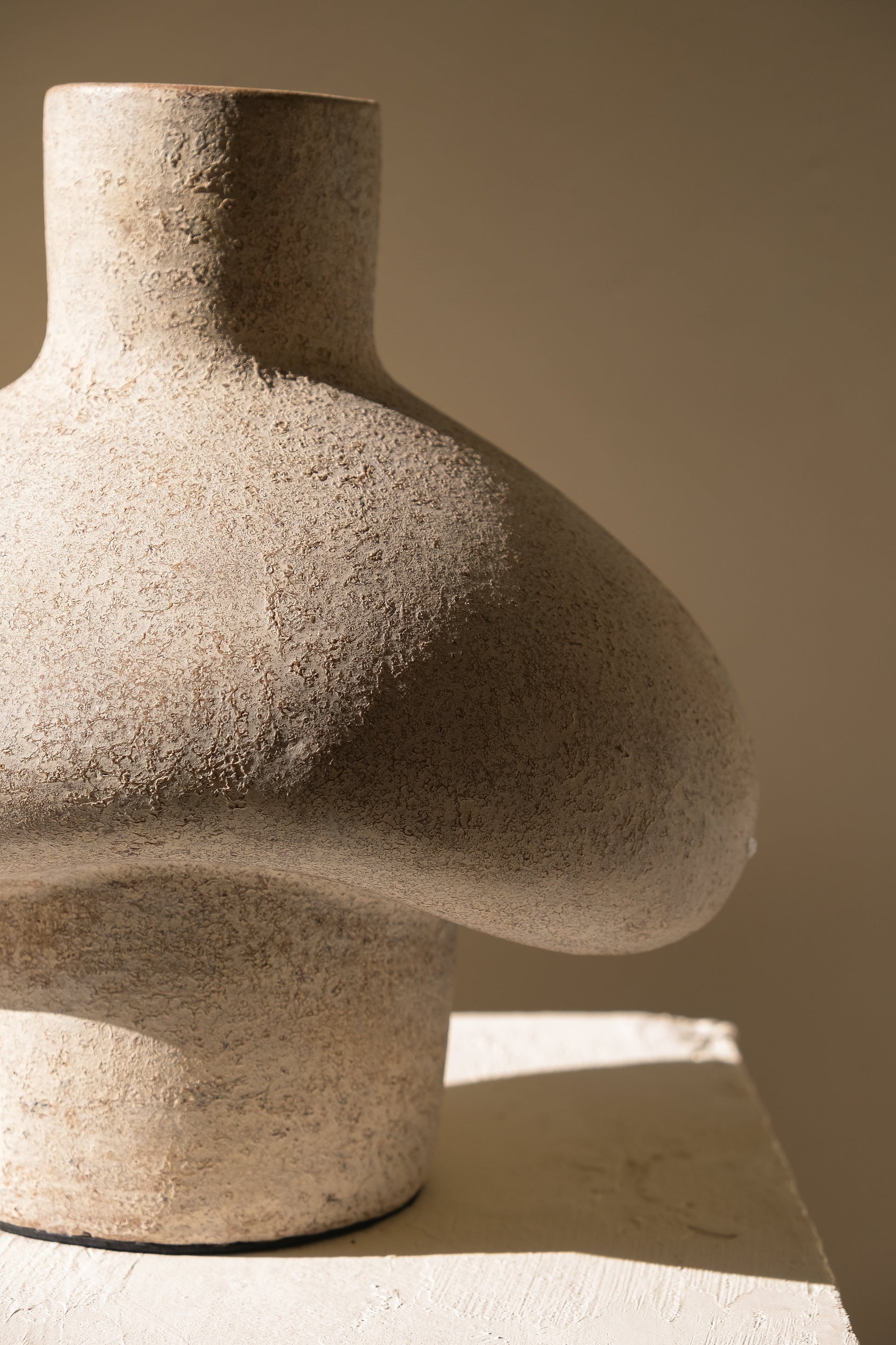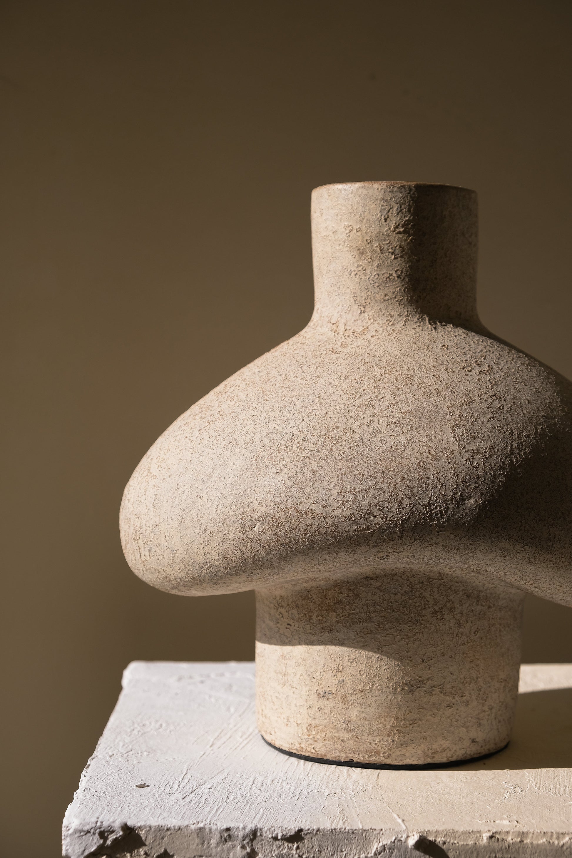 The Tanah vessel is an elegant terracotta sculpture handmade by local Indonesian artisans. The vessel's name comes from the marvelous Tanah lot, an ancient Hindu temple dedicated to the gods of the sea. Its pristine shell-white color gives a beachy feel, while its interesting shape that resembles a hut is a callback to coastal living. This beautiful sculpture is the perfect addition to any room, desk or counter, a fusion of functionality and creativity crafted using techniques that have been passed down through generations. Use it as a vase for your dry stem or as a standalone display.