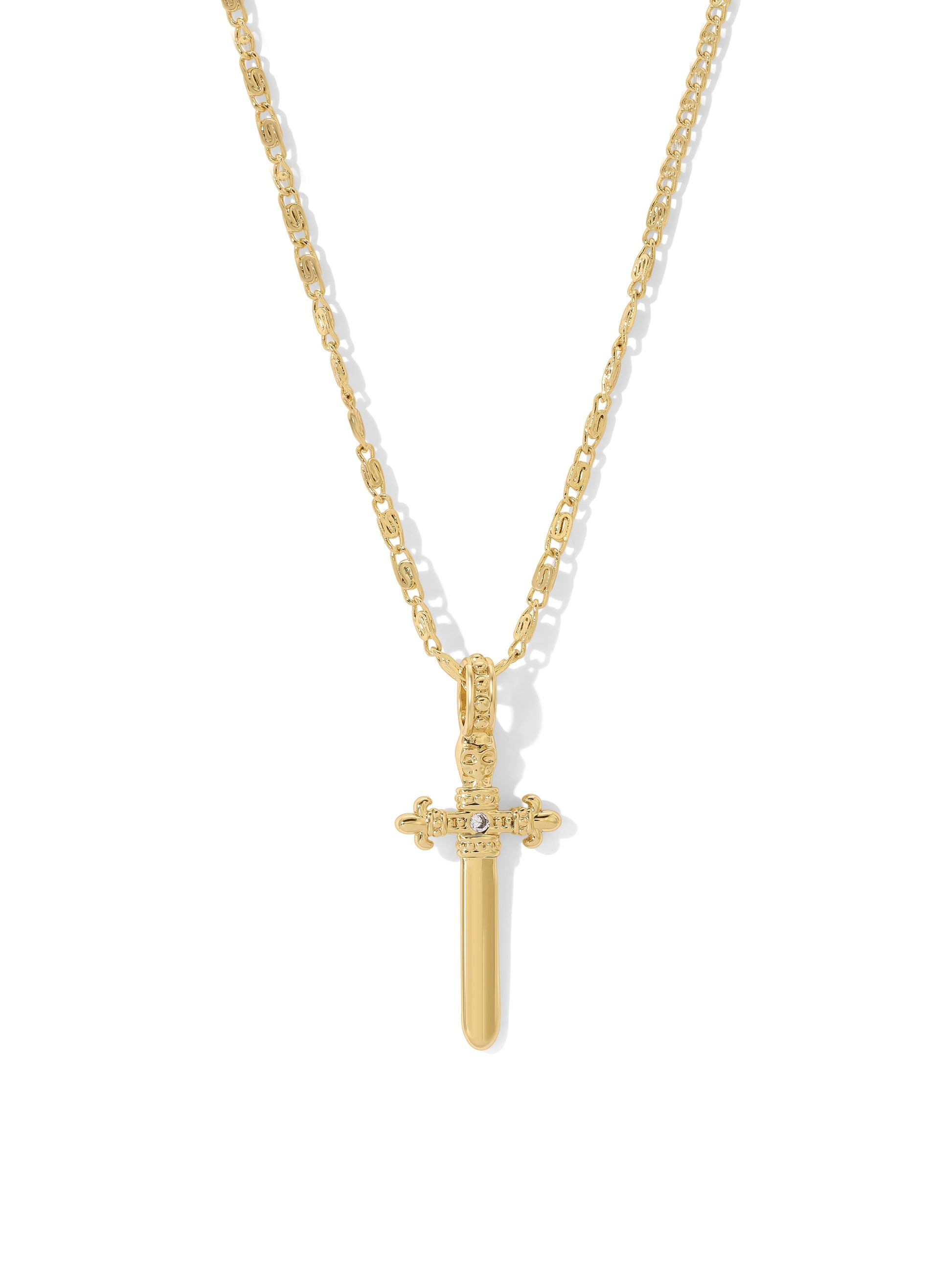 Features a delicate twisted-link chain hung with a lightweight dagger charm, adorned with a tiny skull, fleur-de-lis handles, and a crystal CZ stud at its center. Made from 18K gold-dipped brass and finished with a lobster clasp closure.