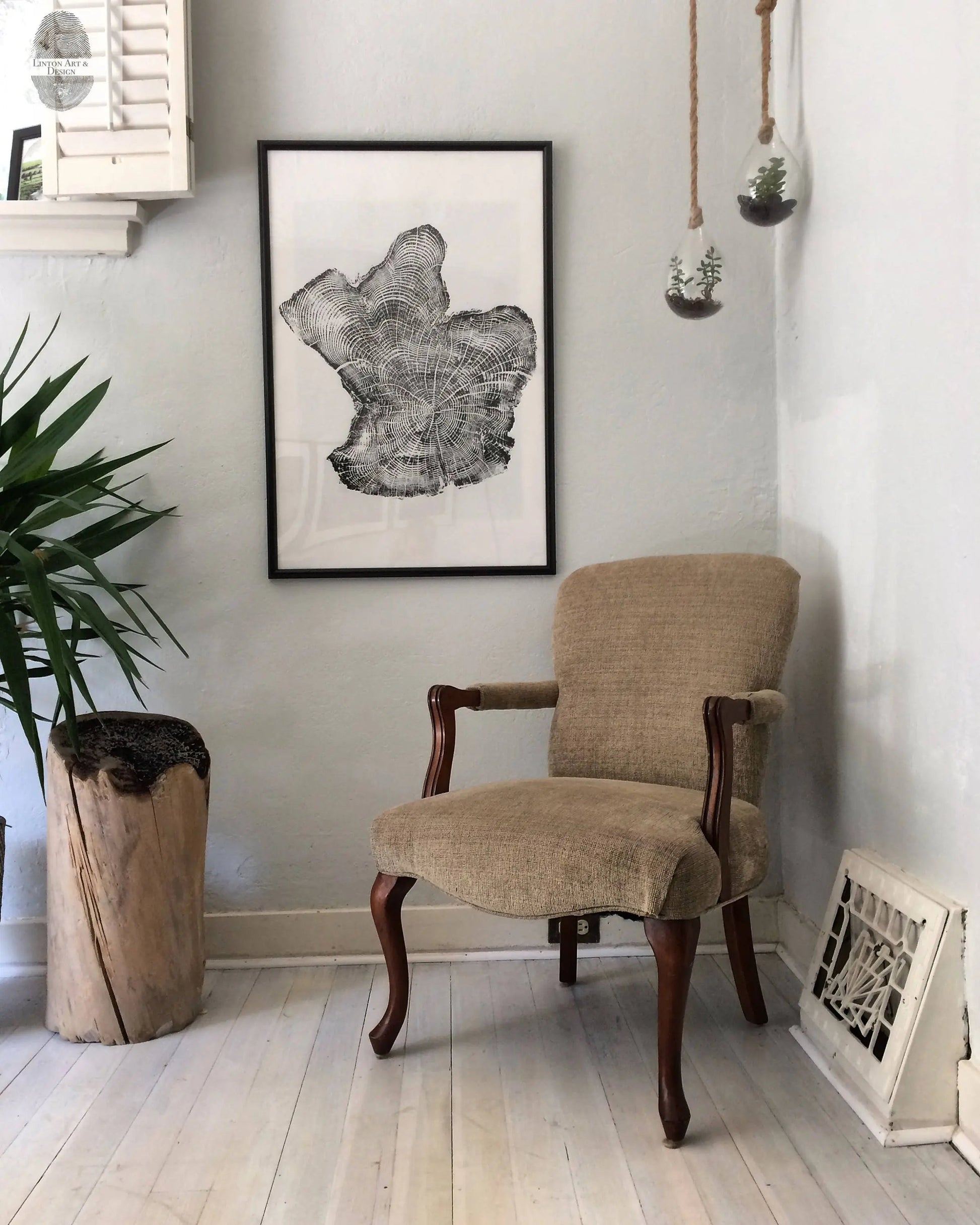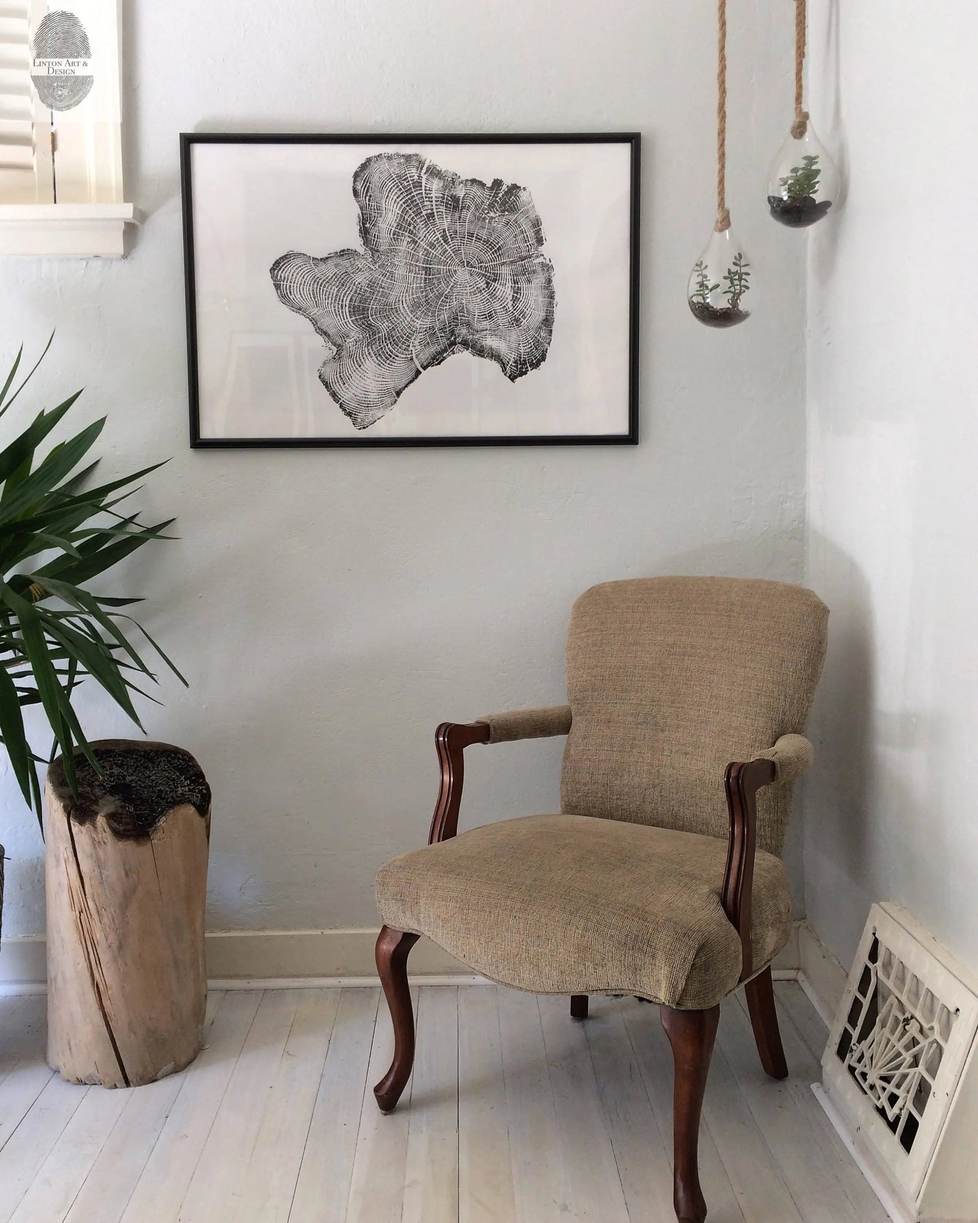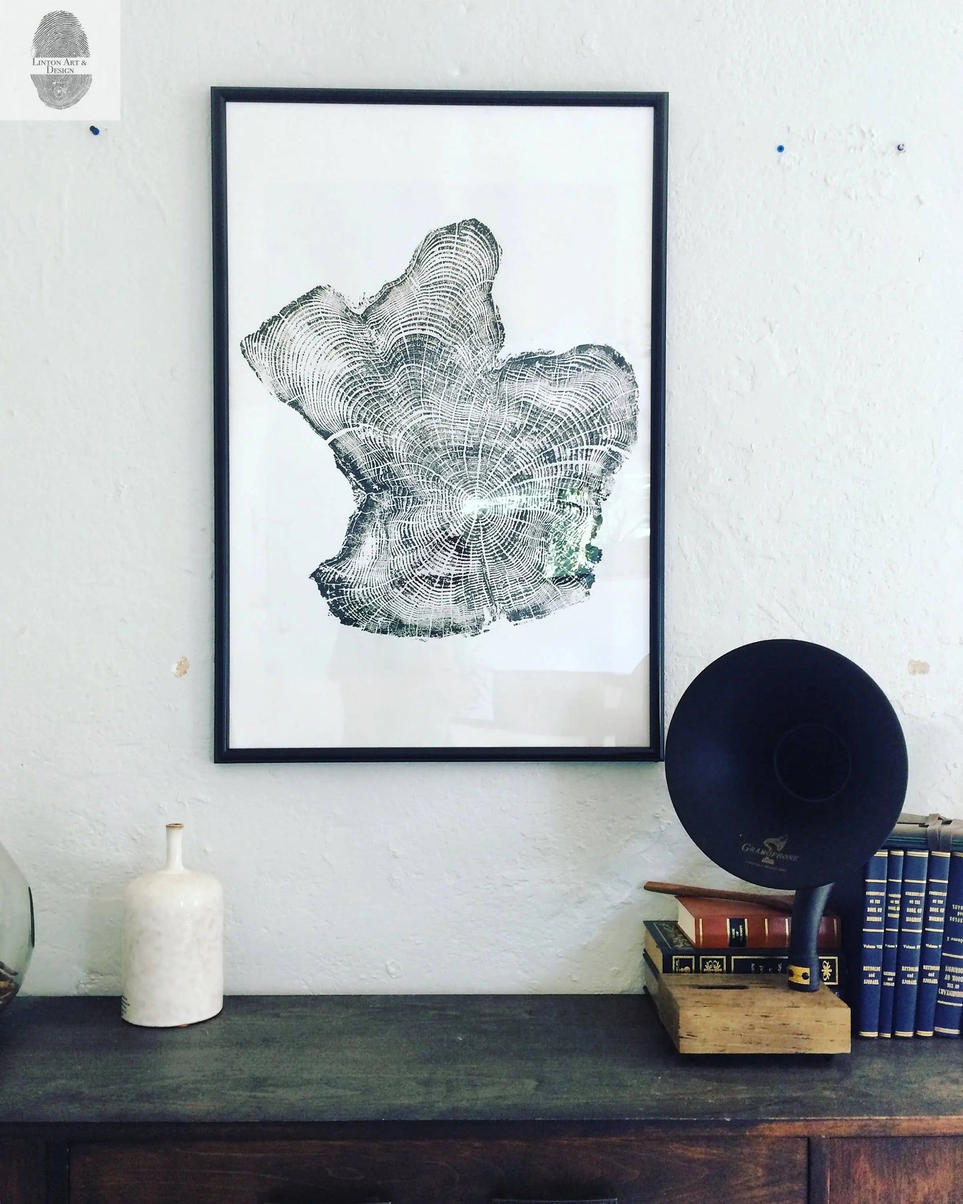 “I bought this print and another one for my wife for our 1st wedding anniversary. I thought it symbolized the traditional paper theme for the 1st anniversary perfectly. The tree for the main element in paper and the tree rings symbolize the years memories that we will record for our lifetime. Linton Art’s work is beautiful, and will be a perfect feature in our new home.” -David