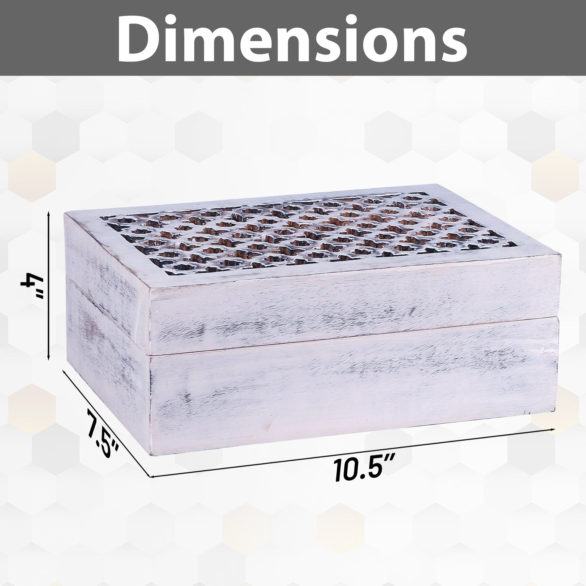 Our wood storage box adds sophistication to your room. We’ve built our home storage boxes to be strong, durable, and scratch-proof. These decorative boxes for home decor are handcrafted from natural Mango wood to ensure longevity and functionality. The wooden jewelry box for women and men features quality craftsmanship from the creative hands of our Indian Artisans. The intricate hand carving on the lids of these wooden boxes for centerpieces adds a sophisticated charm to your living space. Our decorative wooden gift box is perfectly sized for your needs. The decorative medium size wood box is an easy and stylish way to organize and stash away your mail, keepsakes, jewelry, and assorted accessories! ---