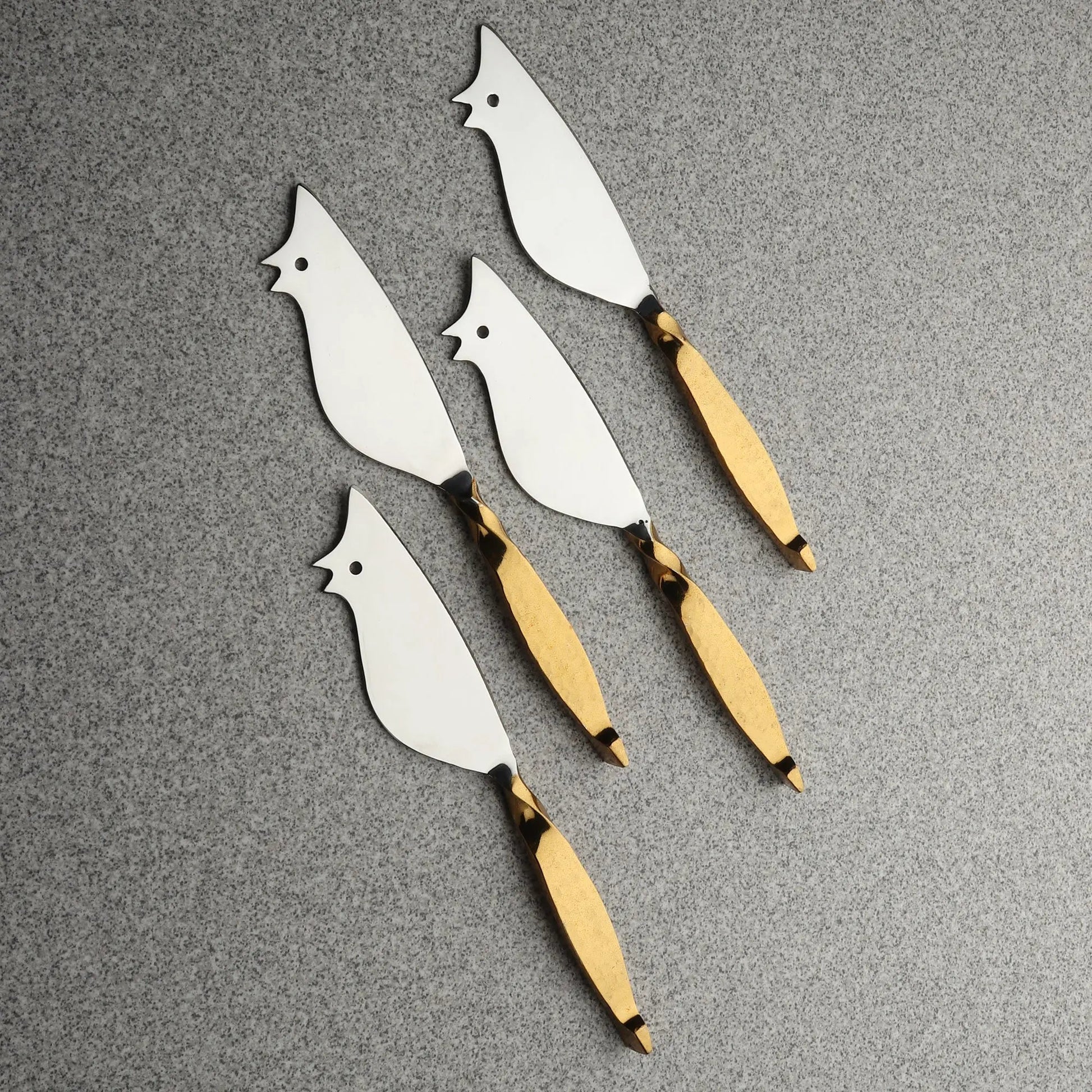 The Twisted Urban Vintage Gold Ratoncito Cheese Spreader/Knife Set features mouse-shaped cheese spreaders with pointed snouts and ears, perfect for spearing cheese cubes, pickles, and olives. Showcasing polished stainless steel knives and contrasting hammered gold "tails", these small cheese spreader knives will have a big impact on your charcuterie boards.