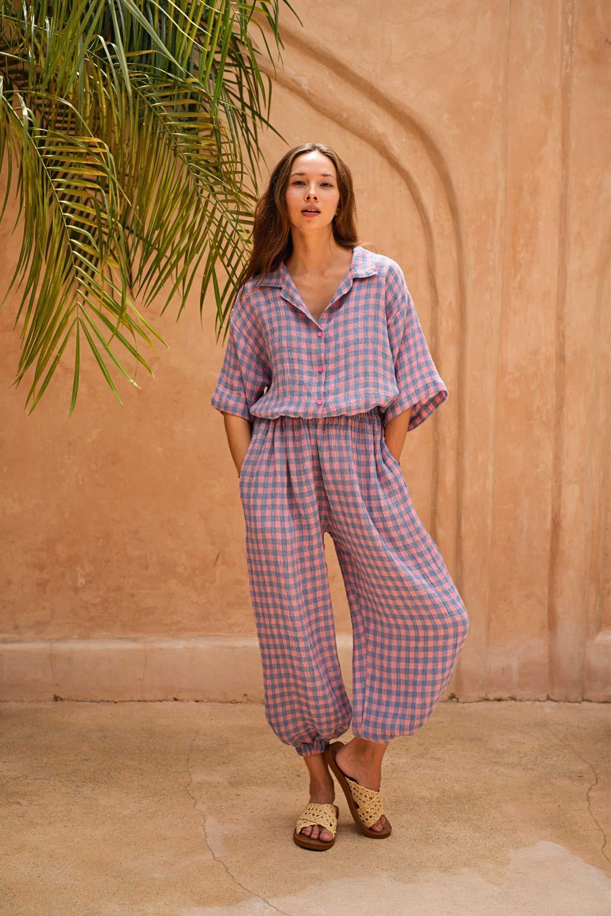 Vanessa Linen Gingham Balloon Pants in Lavender