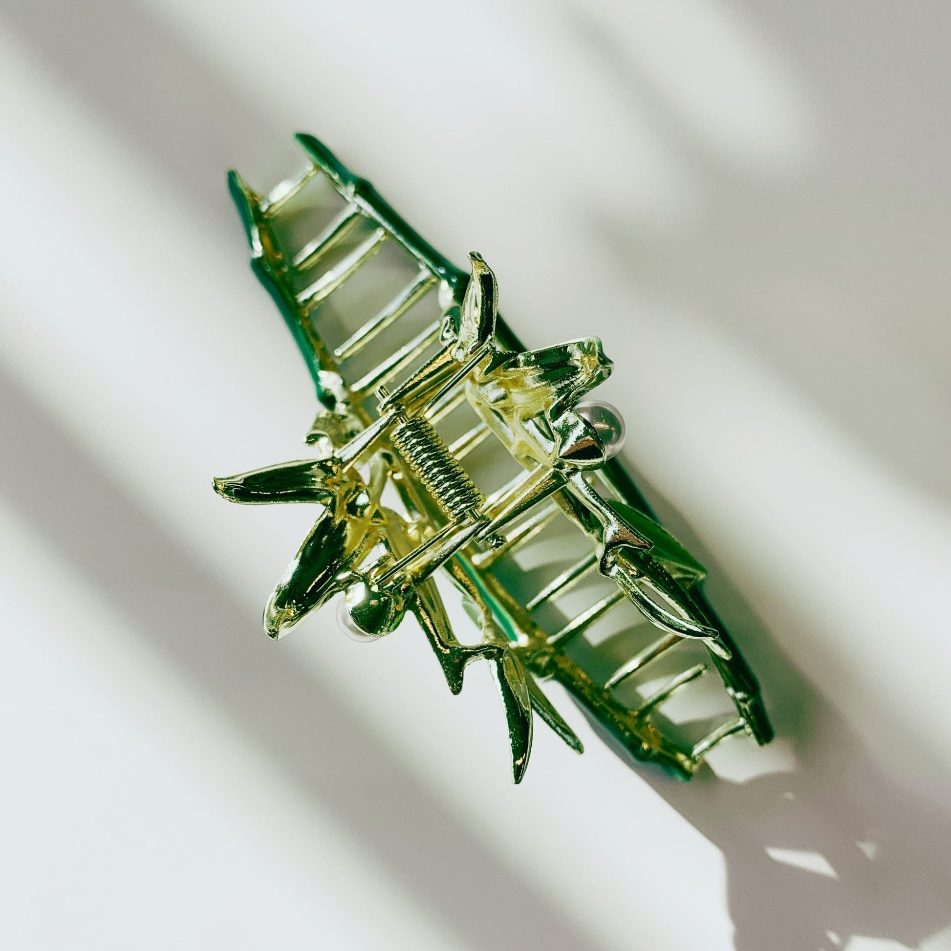 Secure your tresses with this luxurious metal hair claw clip sculpted to depict deep green bamboo. A pearl accent rounds out the luxe look.