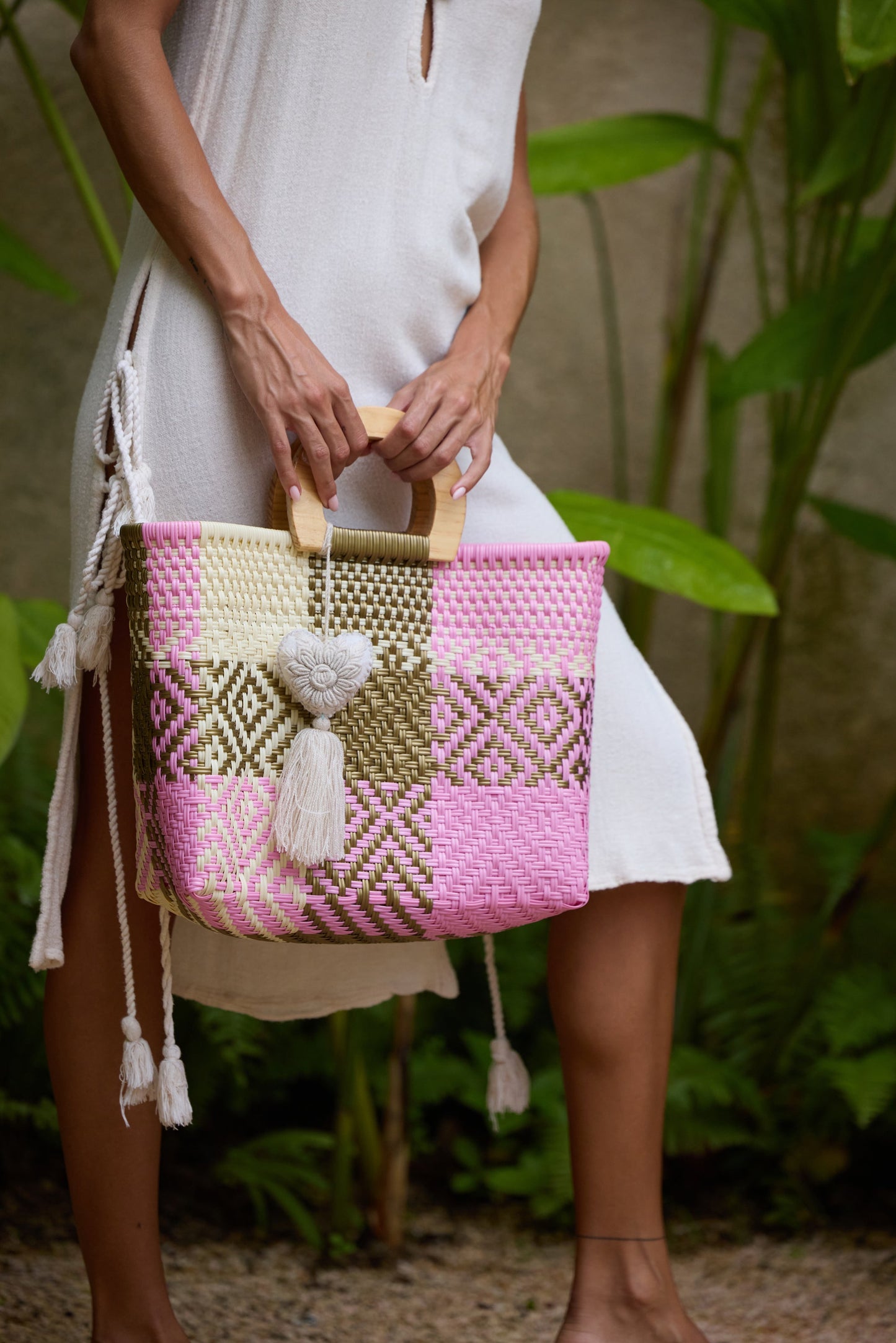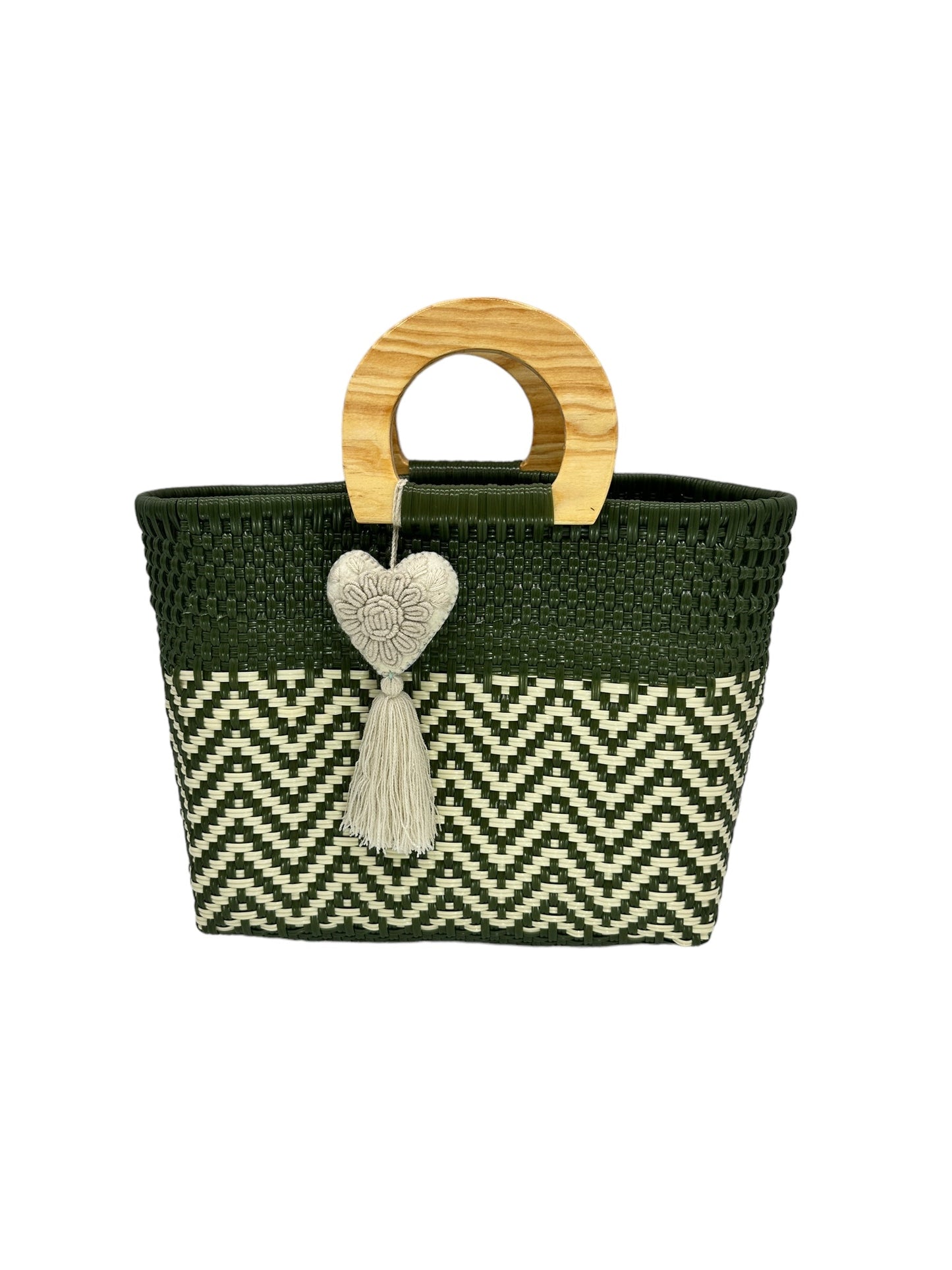Handmade in Mexico - each measures 14"L x 14"H x 5"W with 8" looped wooden handles.