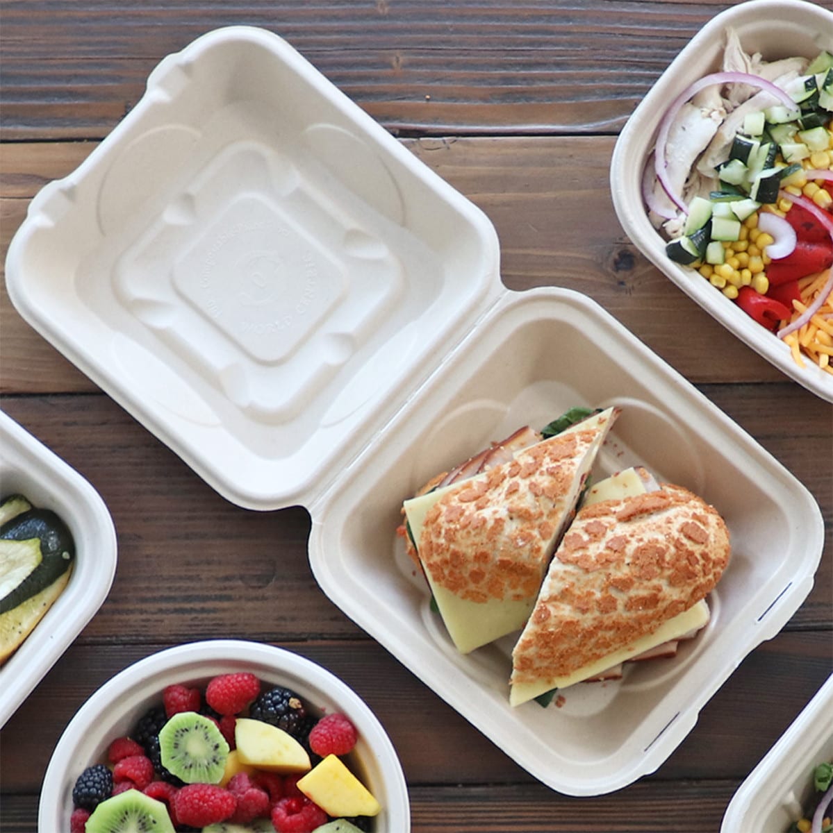 World Centric® 8x8x3" fiber clamshells are made from bamboo and unbleached plant fiber. These takeout containers are compostable, durable, grease and moisture resistant, freezer safe, and have no wax or plastic lining. Great for takeout restaurants, cafes, and food trucks. Composts in 2 to 4 months in a commercial composting facility.