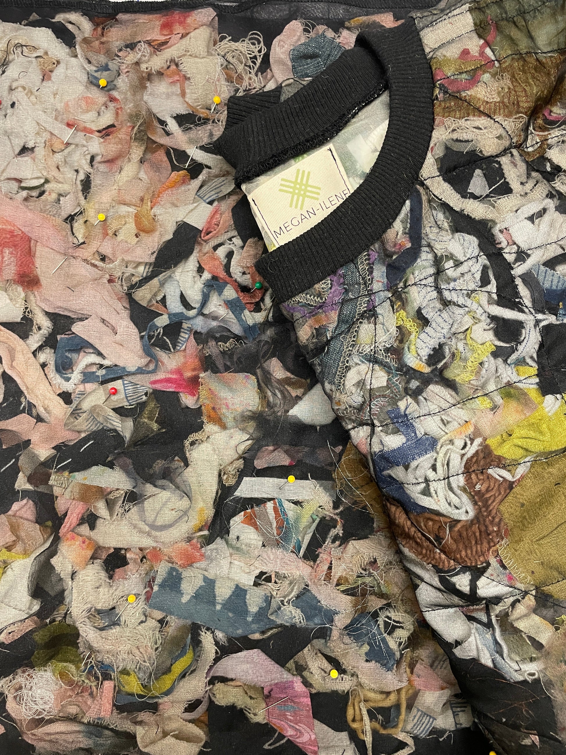 This is a new take on waste management *natch where we sandwich the thread ends in between two layers of silk organza. Each pattern piece is cut twice, lovingly scattered with a scrap-thread confetti and then free motion quilted together. So much work! But oh, so cool.